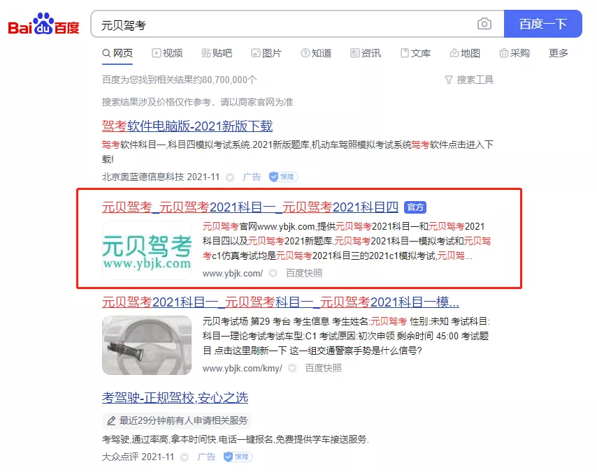 途径三:浏览器搜索:“元贝驾考”,点击带有【官方】标签的链接。