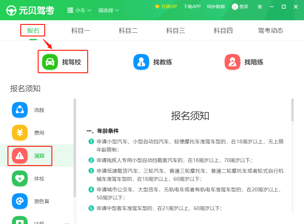 刷题前可以先阅读下左侧的【报名须知】,如果你现在还没有报考驾校,元贝驾考【找驾校】功能这时就派上用场啦,选择你所在的城市,资质过关的本地驾校名单任你挑选。