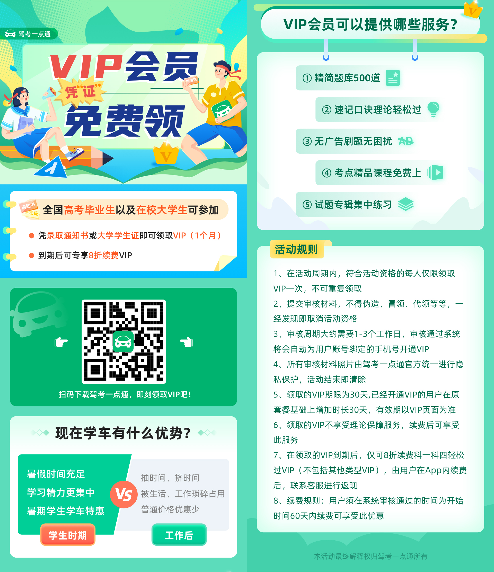 转眼间,已经7月中下旬了。对于高考学子和大学生们来说暑假已经有一段时间啦。许多小伙伴都在假期选择了考驾照,但是这个天真的太热了,为了帮助小伙伴们顺利效率的拿到驾照,驾考一点通学车vip免费领!!!划重点:不止高考毕业生,全国在校大学生都可以参与噢!赶紧来看看吧~