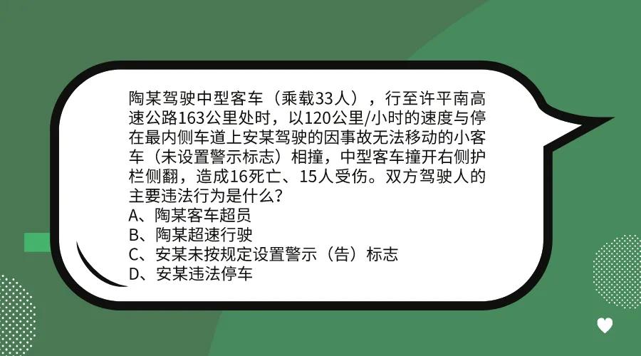 很多学员认为安某违法停车,但要注意题干说的是“停在最内侧车道上安某驾驶的因事故无法移动的小客车”,安某的汽车是因为故障无法移动所以才会停在最内侧车道上,并不是主观上的违法停车,注意审题。