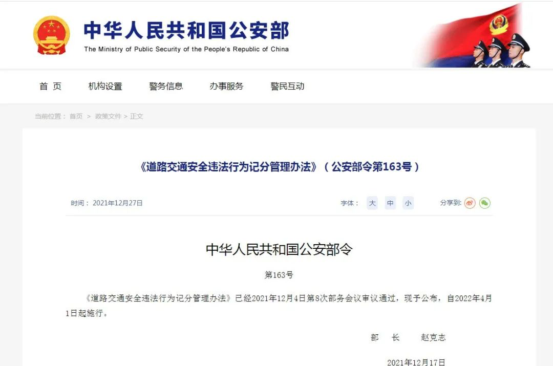 公安部发布新制定的《道路交通安全违法行为记分管理办法》(公安部第163号令)将于2022年4月1日起正式施行,2022版《办法》在保持对酒后驾驶、交通肇事致人伤亡后逃逸、使用伪造变造牌证等严重妨碍交通安全的违法行为高压态势的前提下,根据对道路交通安全畅通影响的程度,对交通违法记分做了调整,相比“2016版”交通违法与记分,2022版记分的交通违法共50项,其中7项记12分,7项记9分,11项记6分,15项记3分,10项记1分。记分类型增加了扣9分、删除了扣2分的违法行为。