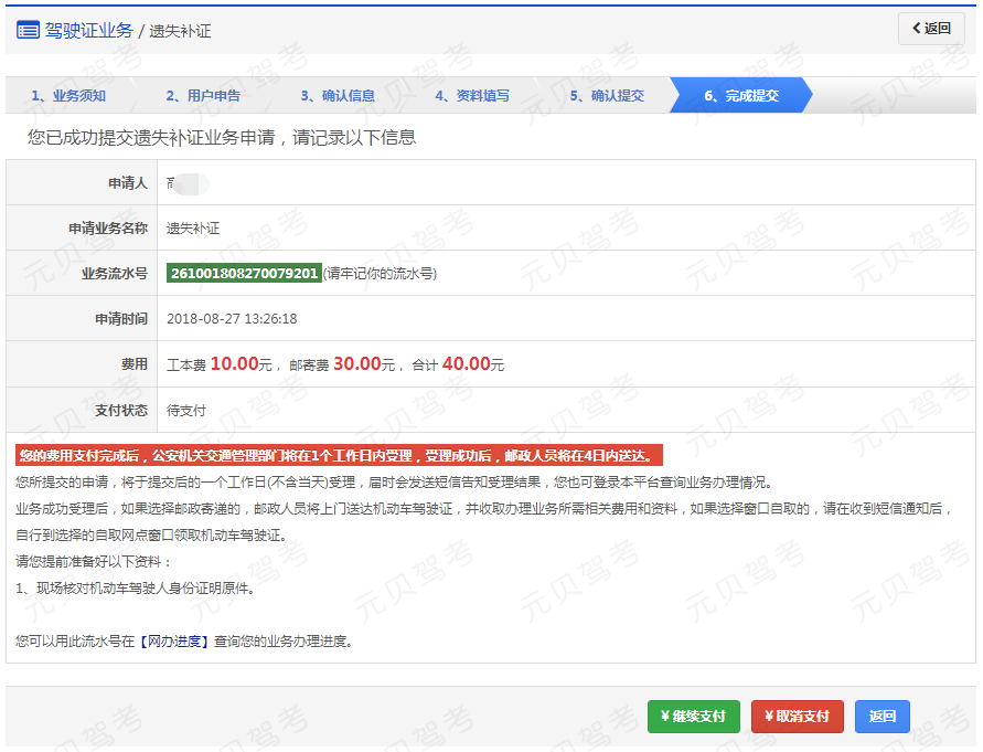 该步骤提交成功后,系统生成业务流水号。该步骤提交成功后,系统将于提交后的一个工作日(不含当天)受理(选择在线支付的业务费用支付完成后受理),届时会发送短信告知受理结果。用户可以根据该业务流水号在网办进度中查询业务办理进度。