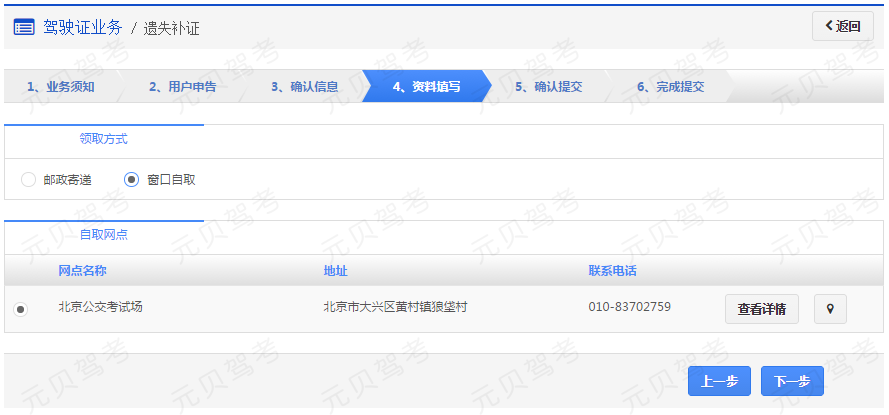 在该步骤,用户选择领取方式是邮政寄递或窗口自取。业务成功受理后,如果选择邮政寄递的,邮政人员将上门收取费用,交付机动车驾驶证及收费票据。如果选择窗口自取的,则自行到选择的自取网点窗口领取机动车驾驶证。