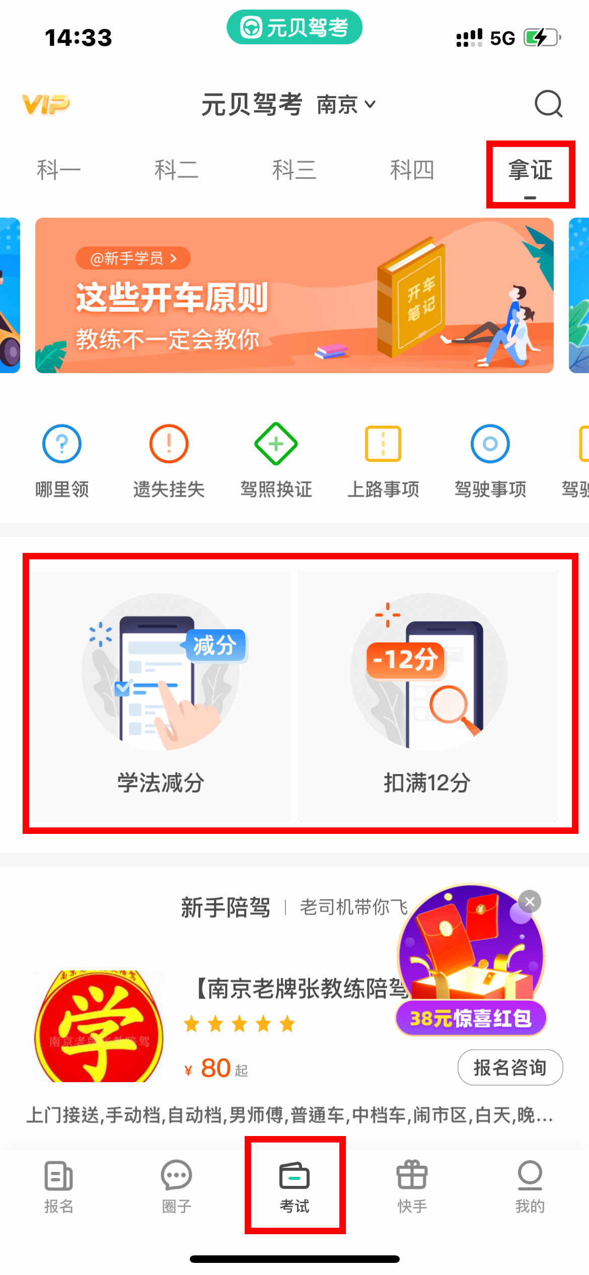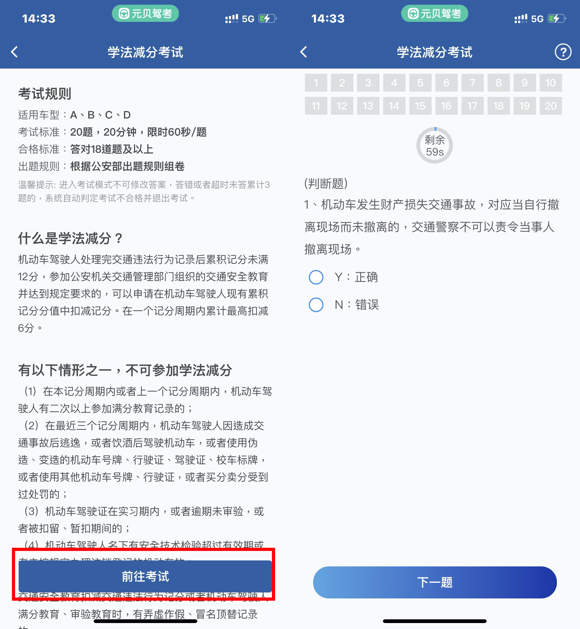 打开元贝驾考app-点击【考试】-【拿证】-【学法减分】,即可参与学法减分考试,题库全国通用。