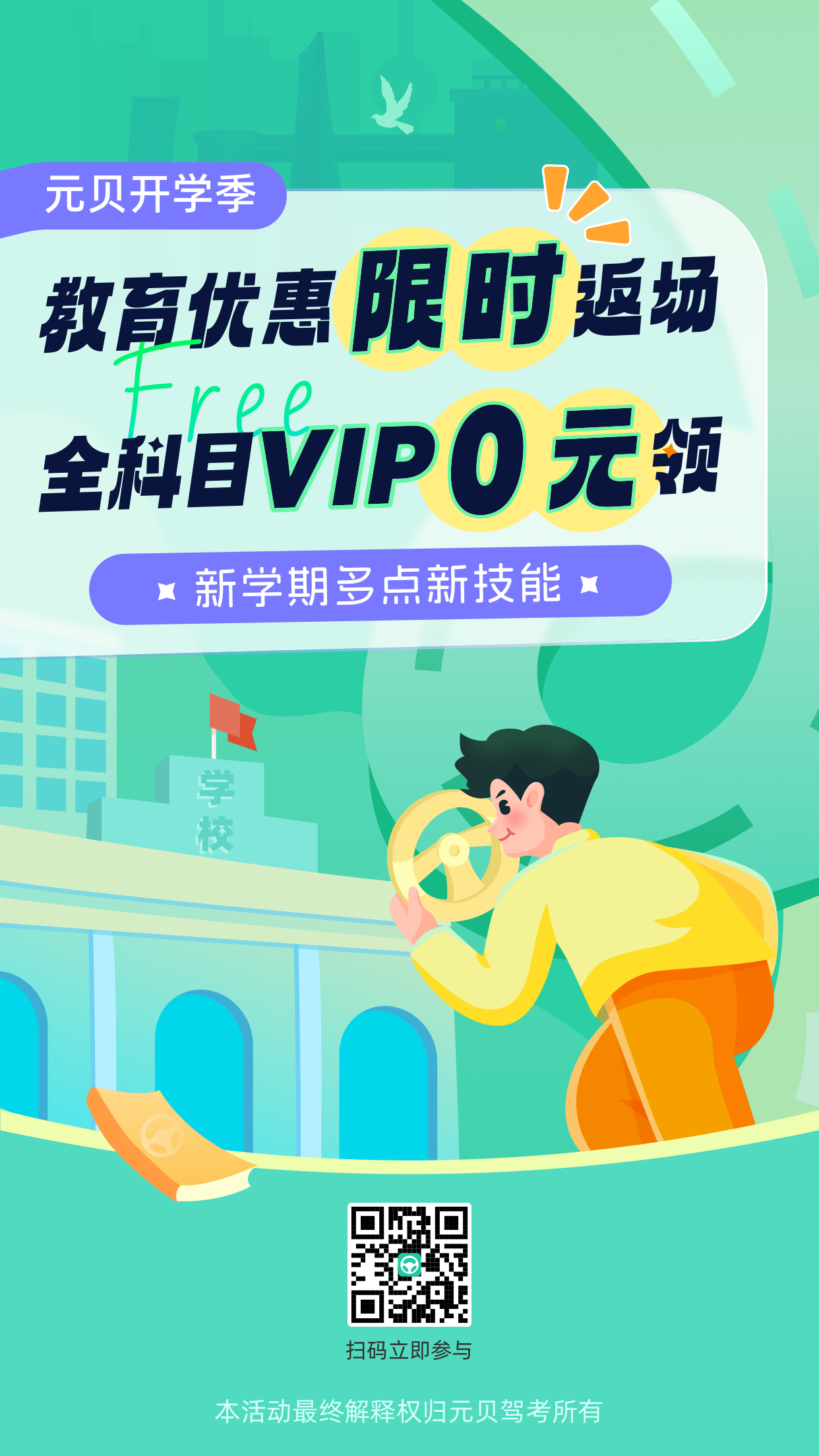 为了帮助更多学子顺利拿到驾照,元贝驾考教育优惠活动限时返场啦,全科目vip免费领!
