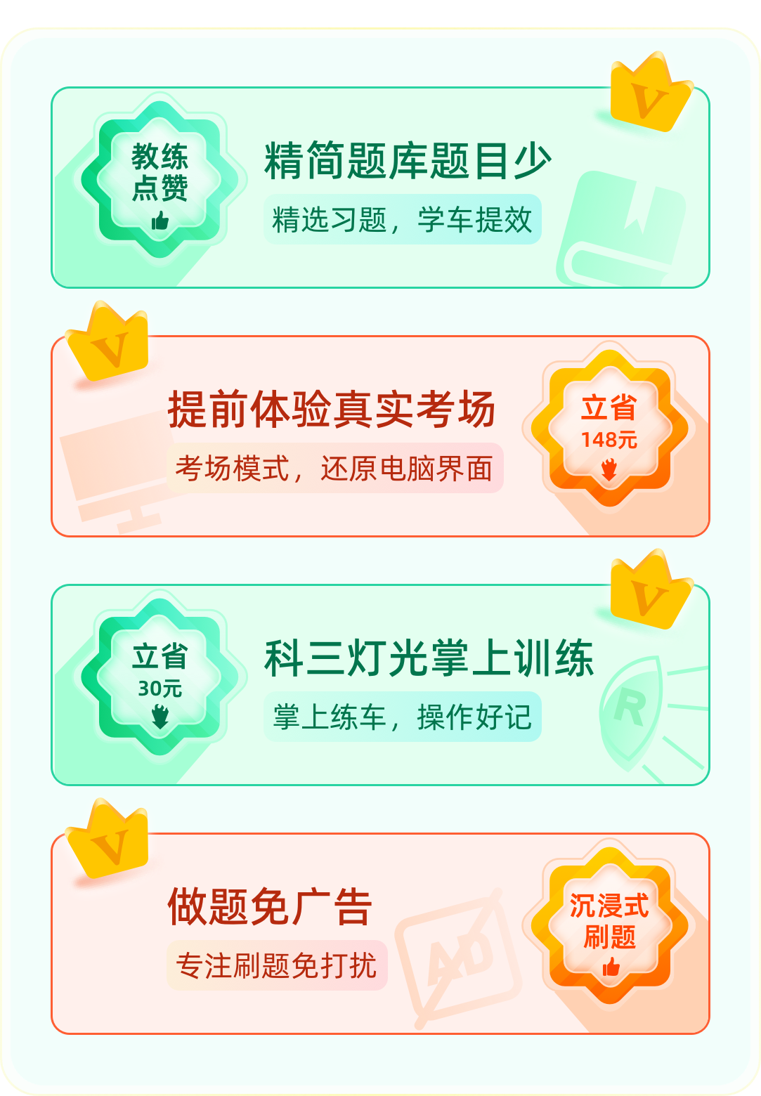 精简题库,提升效率省时间;考场模式,提前体验真实考场;灯光模拟,多款考试车型适用;去除广告,专心做题请勿打扰;考前2小时,科一科四划重点冲刺;三天特训,强化练习巩固技巧......