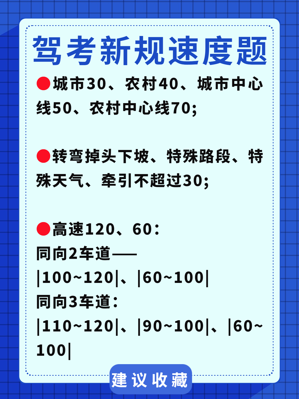 记住一句很实用的口诀:【无图问时速 都选30公里】。也就是说,只要是没有图片的、问速度的选择题,答案都选择30公里。
