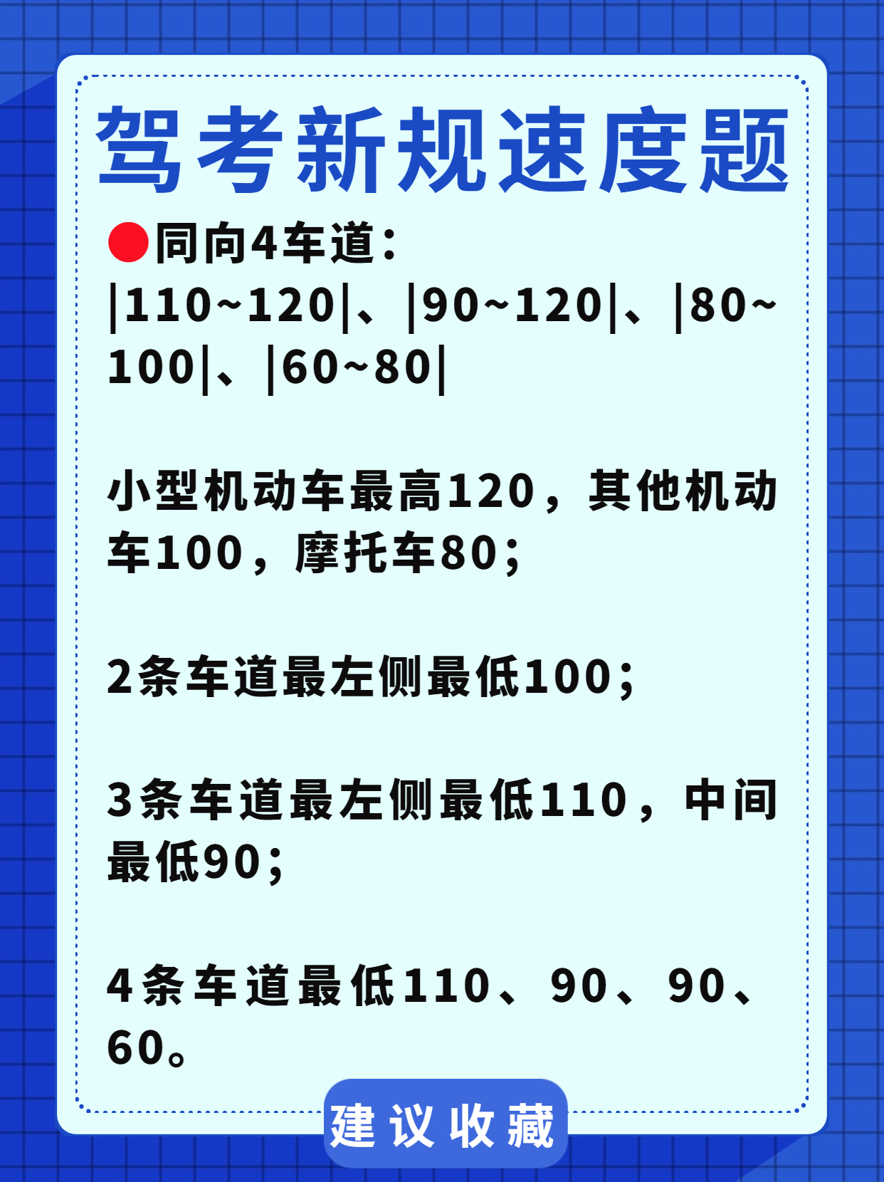 科一关于车速的记忆方法,就是这些了。虽然知识点杂乱不易记忆,但是采用顺口溜式的速记口诀,就很效率易懂易记忆了正在备考科一的学员不妨收藏~