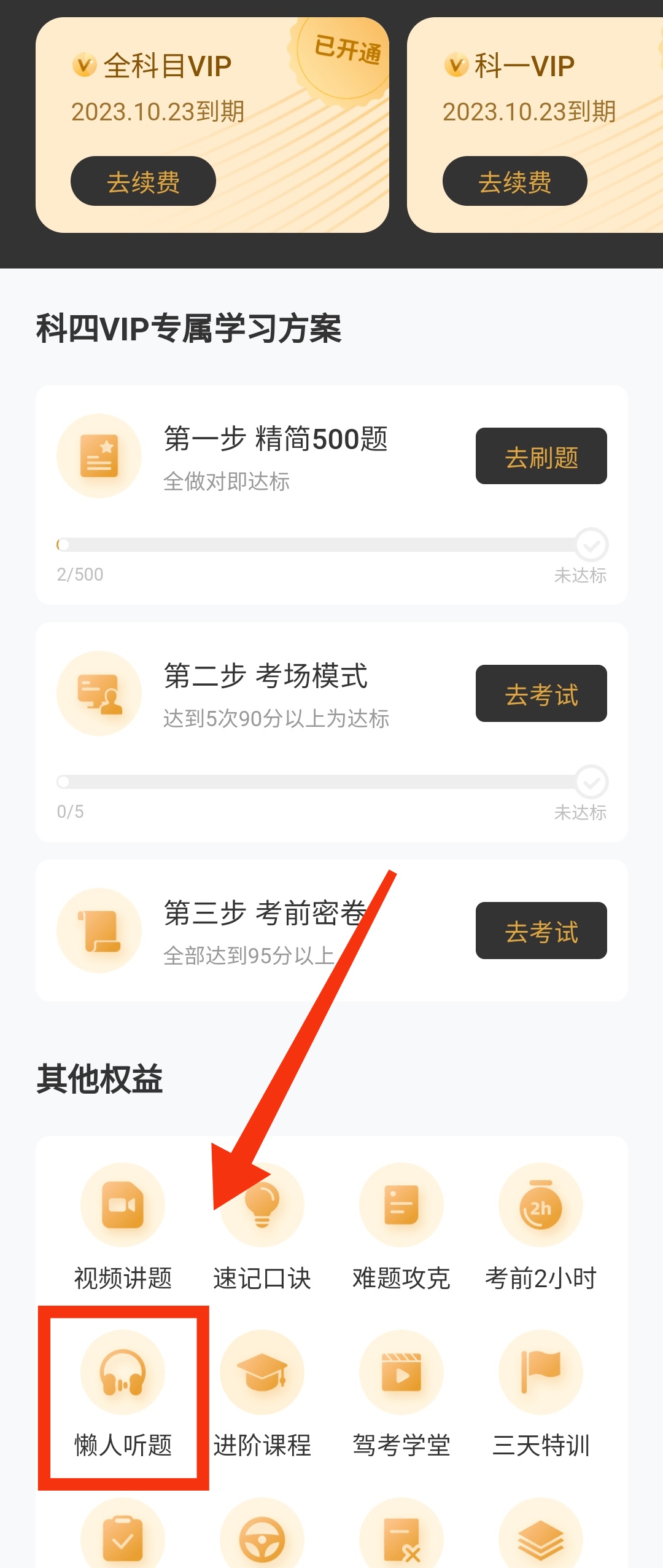 大家只需要购买全科目vip、科一vip、科四vip任意一种,即可拥有懒人听题。