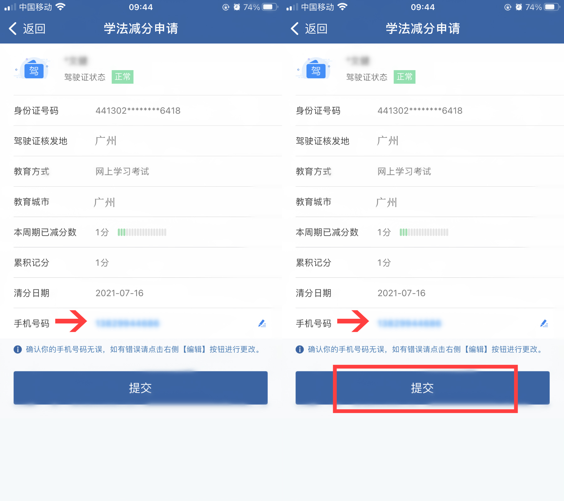 3.查看提交界面信息,若手机号码有误的,可跳转至修改手机号码界面进行修改,若无误,点击【提交】。