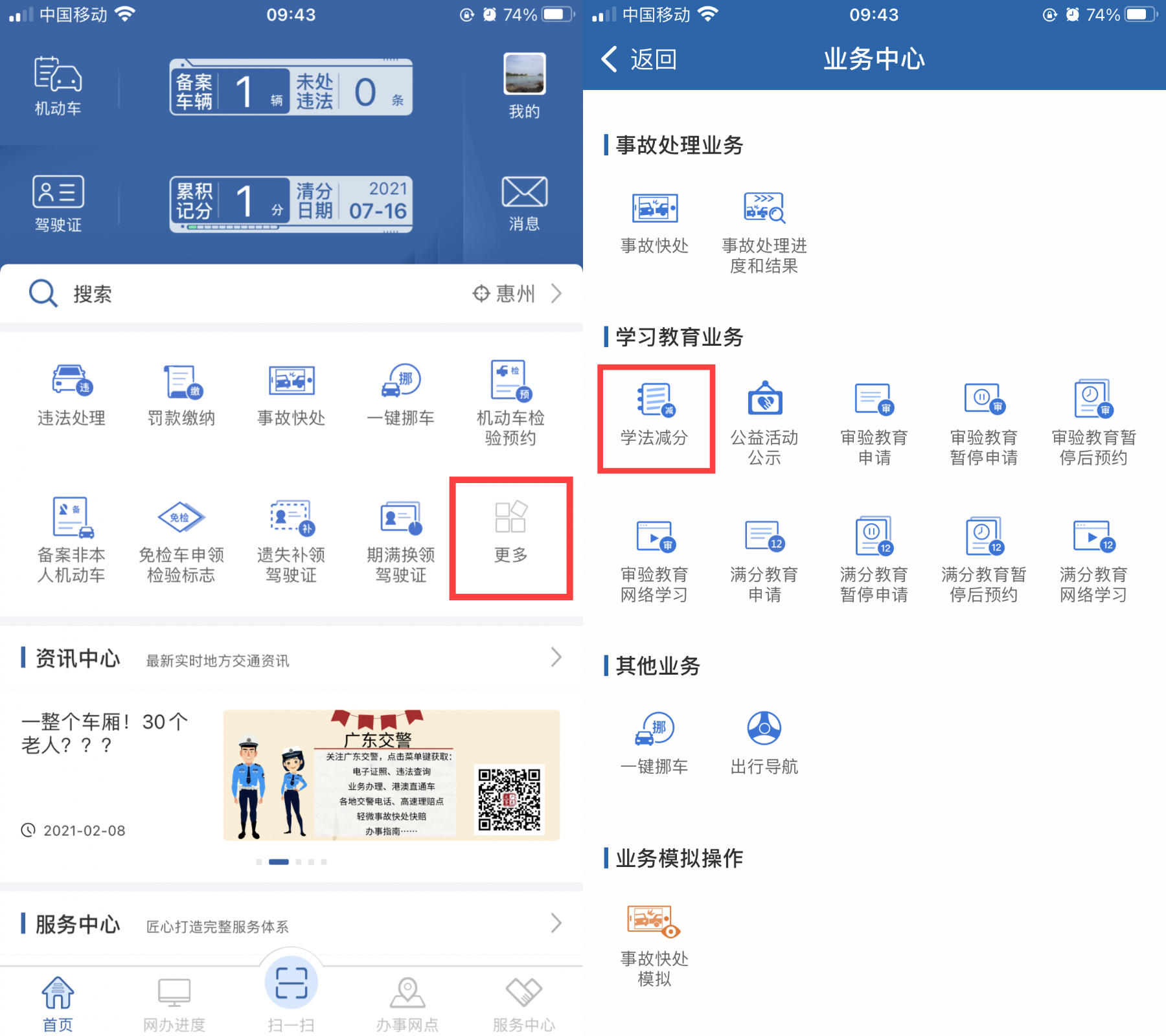 1.打开“交管12123”app,点击【更多】,屏幕下拉选择【学法减分】,进入学法减分申请界面。