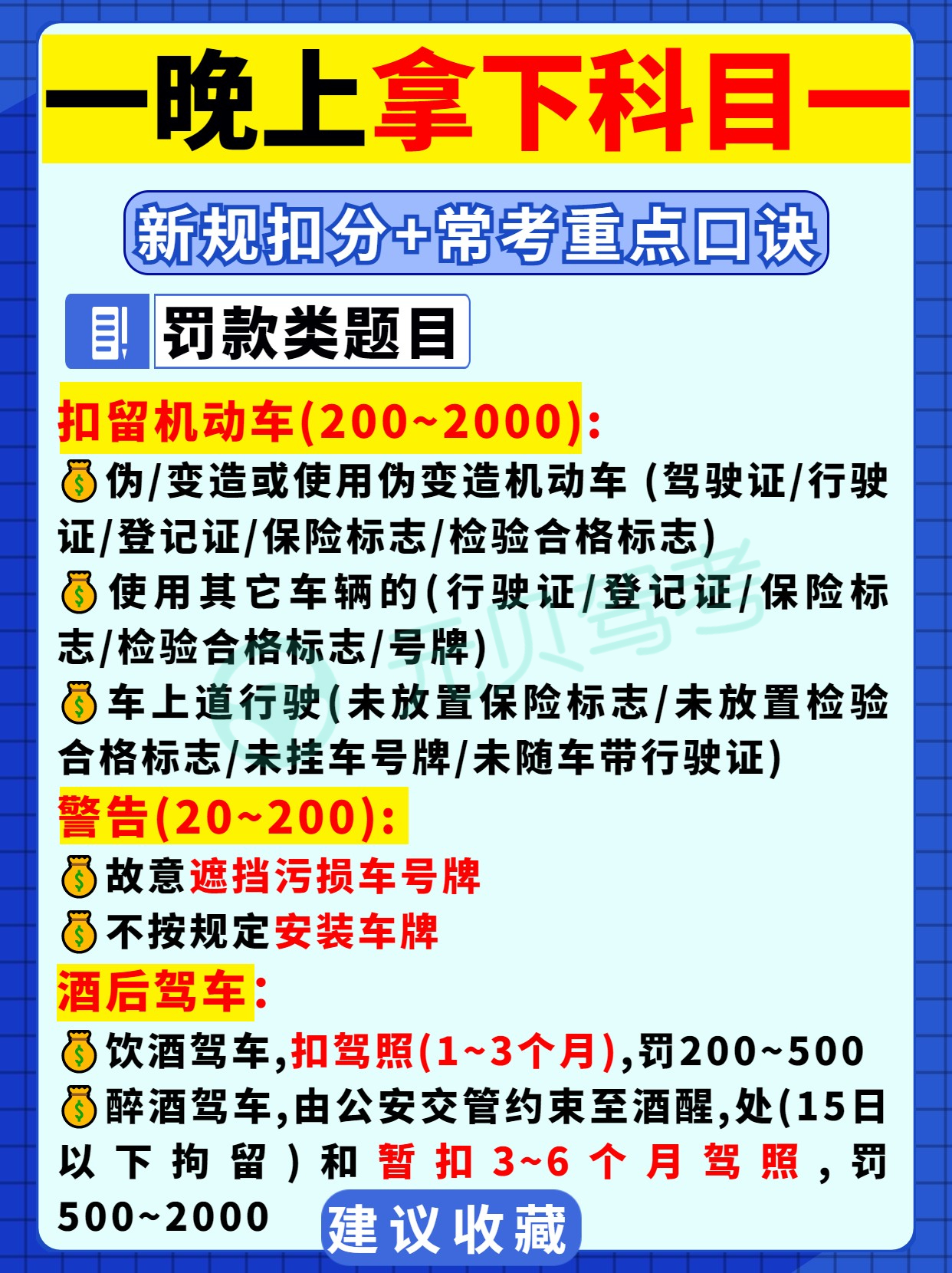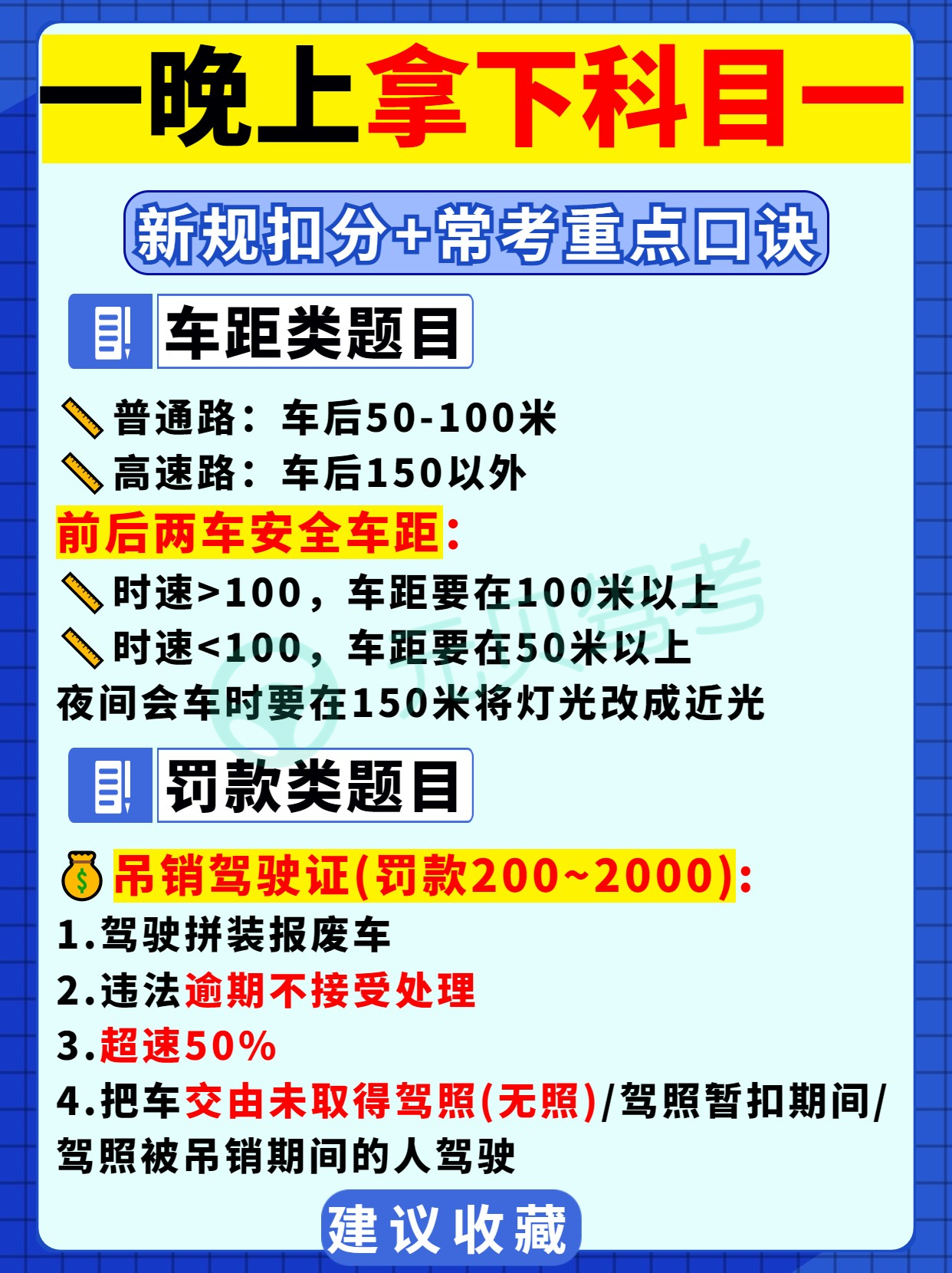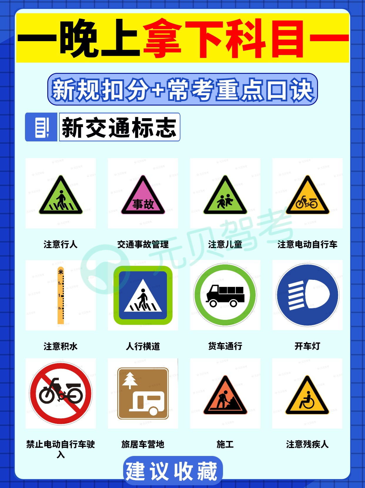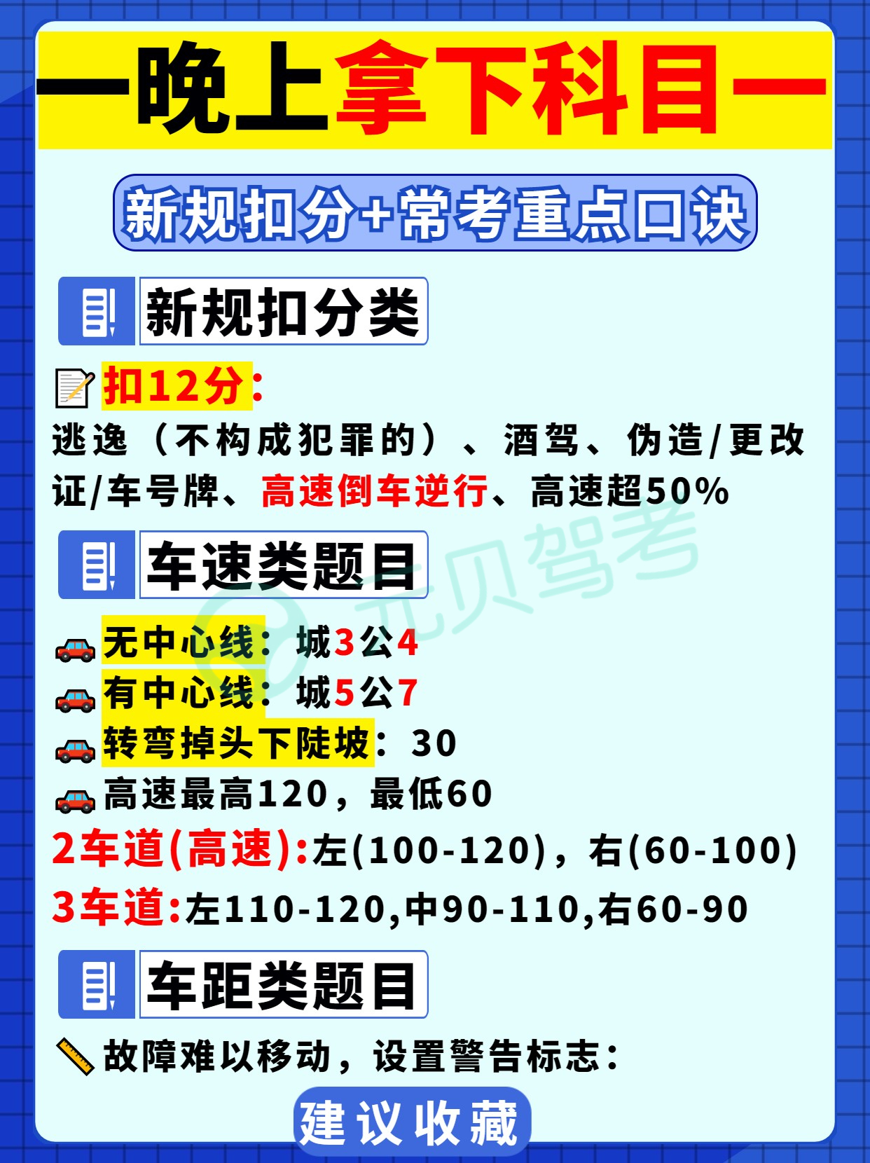 元贝驾考小编整理了驾考科目一的一些速记口诀,分为6大类:时间题、新规扣分题、车速题、车距题、罚款题以及新交通标志。
