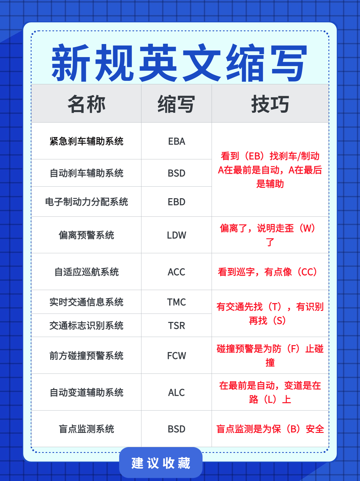 除此之外,元贝驾考小编还考虑到,有些学员在英文方面是佼佼者,相较于运用谐音来记忆的方法,可能没有知道单词全文记忆得快,所以也特地整理了一份常见新规科目一英文缩写及其全称【学霸专用版】,希望对大家有帮助哦!