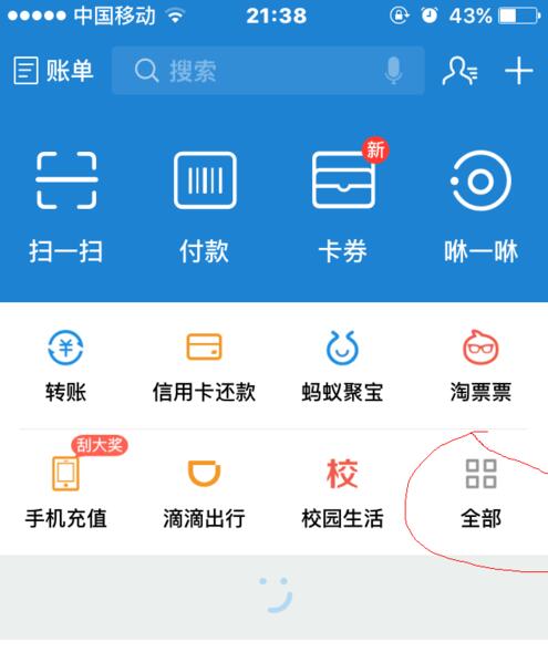 1、下载一个支付宝,输入账号密码登陆,主界面上有个全部,点击进入。