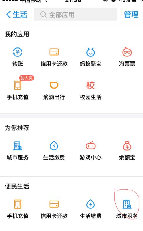 2、在便民服务里面,找到城市服务,点击进入。
