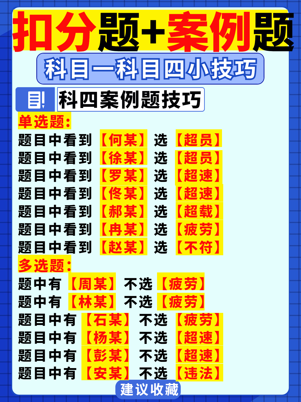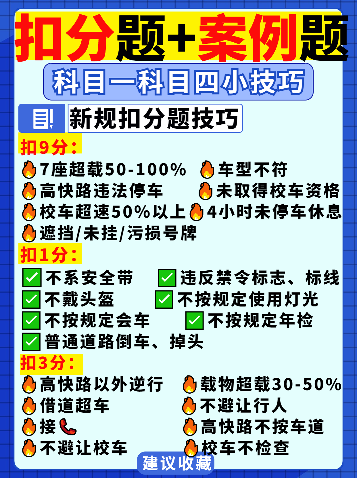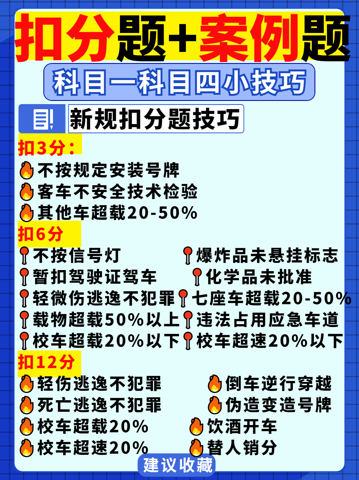 科目一扣分题和科目四案例题是驾考常考题型,对于没时间刷题的人来说,想短时间内记住扣分题或者案例题还是有难度的。今天元贝驾考小编就整理了科一扣分题和科四案例题的技巧,这些真的都是重点,建议大家先码住!