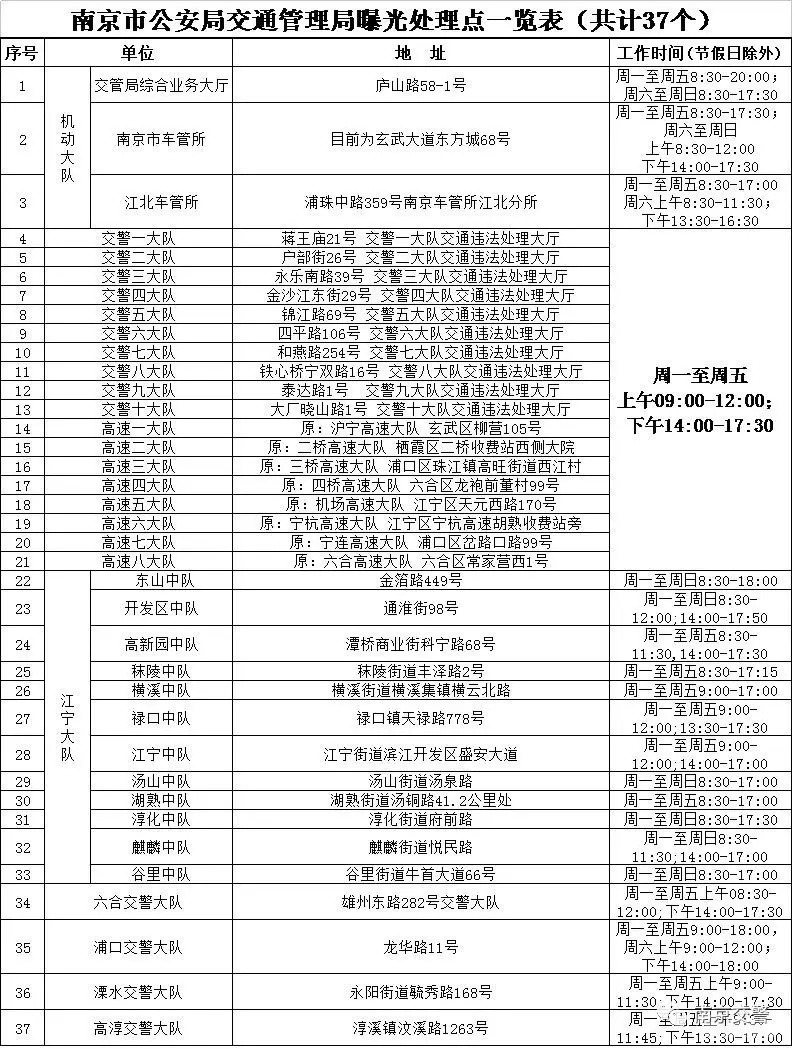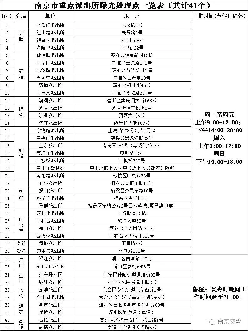 曝光处理方面,一是远程处理模式。交管部门本着便民高效的原则,创新科技化办案举措,推出两种远程处理方式:一种是驾驶人可以通过“南京公安”微信公众号、“我的南京”手机客户端等网络处理系统对交通违法曝光进行处理;另一种是对于累积不满12分的交通违法驾驶人可以在全市41家重点派出所、157家“警邮超市”进行远程处理。二是窗口处理模式。市民可以在车管所、机动大队和各交警大队交通违法曝光处理窗口处理车辆曝光。同时,全面记分工作交管部门设置了一个月的“过渡期”,目的是让广大市民群众有一个理解期、适应期,有效避免全面记分实施前后可能出现的扎堆处理、窗口排队现象。交管部门表示,5月20日前产生的交通违法曝光仍按“老办法”进行处理,5月20日之后发生的交通违法曝光才开始全面记分。因此,对于5月20日前的交通违法曝光,市民群众也没有必要在这一个月的“过渡期”内到窗口集中扎堆处理。