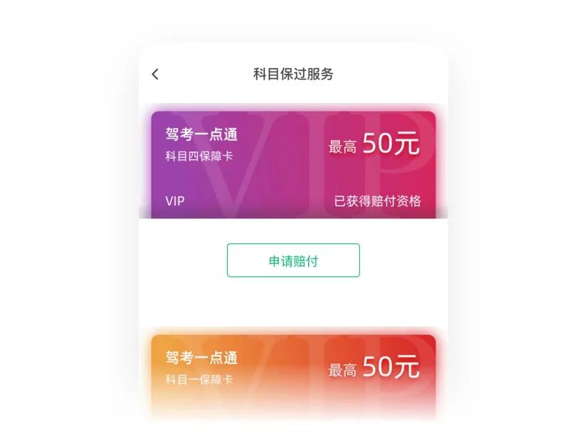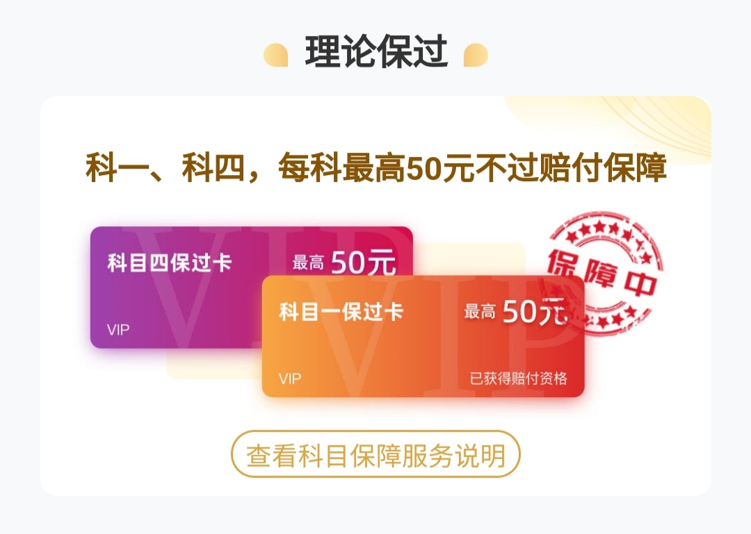 当驾考一点通用户成功开通指定vip,我们将给您赠送科目一、科目四保过卡。若没有通过理论考试,单科立即补偿最高50元现金。(以实际补考费用为准)