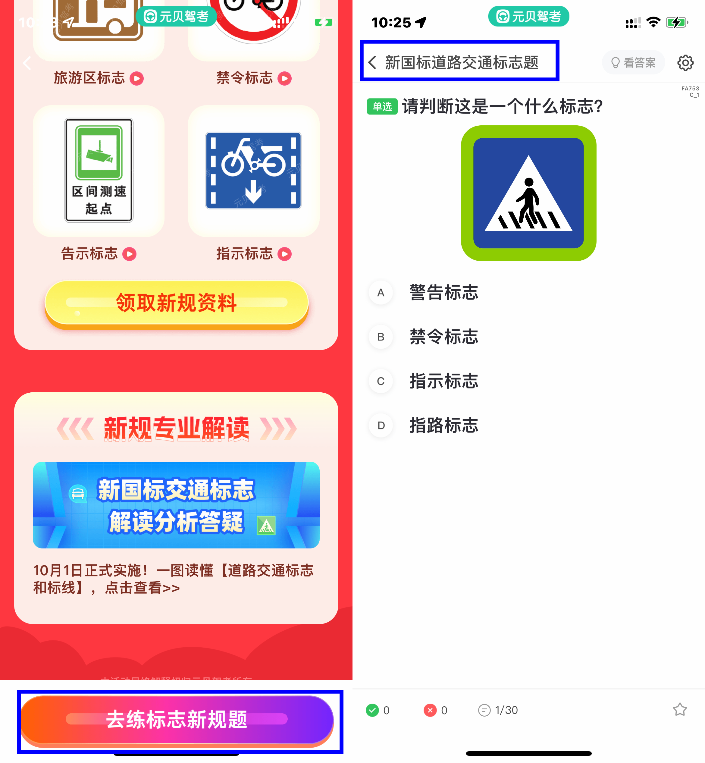 1、进入10月标志新规细则后点击【去练标志新规题】;