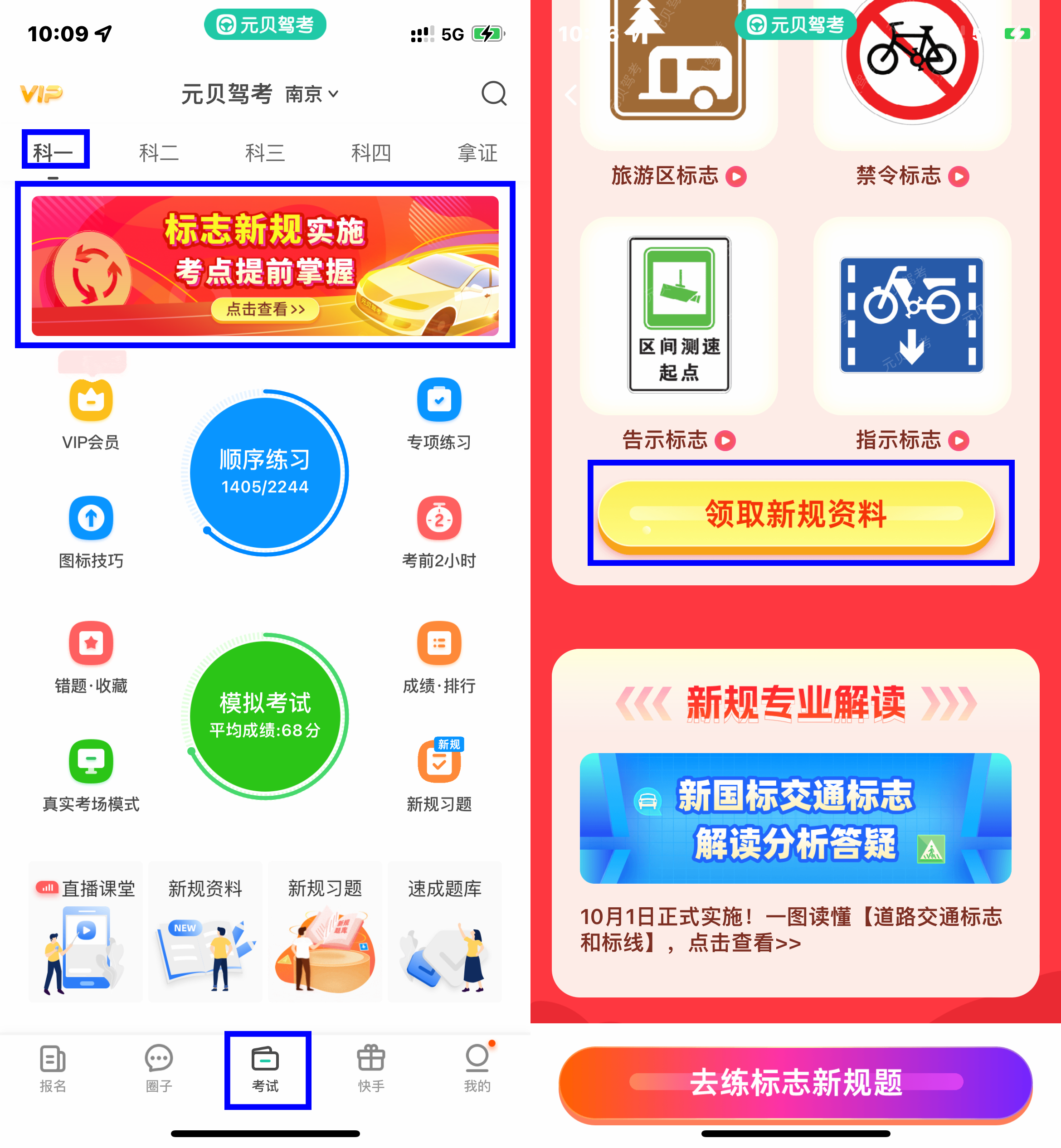 1、点击【考试】-【科一】上方banner,进入10月标志新规细则,下拉可领取新规资料;