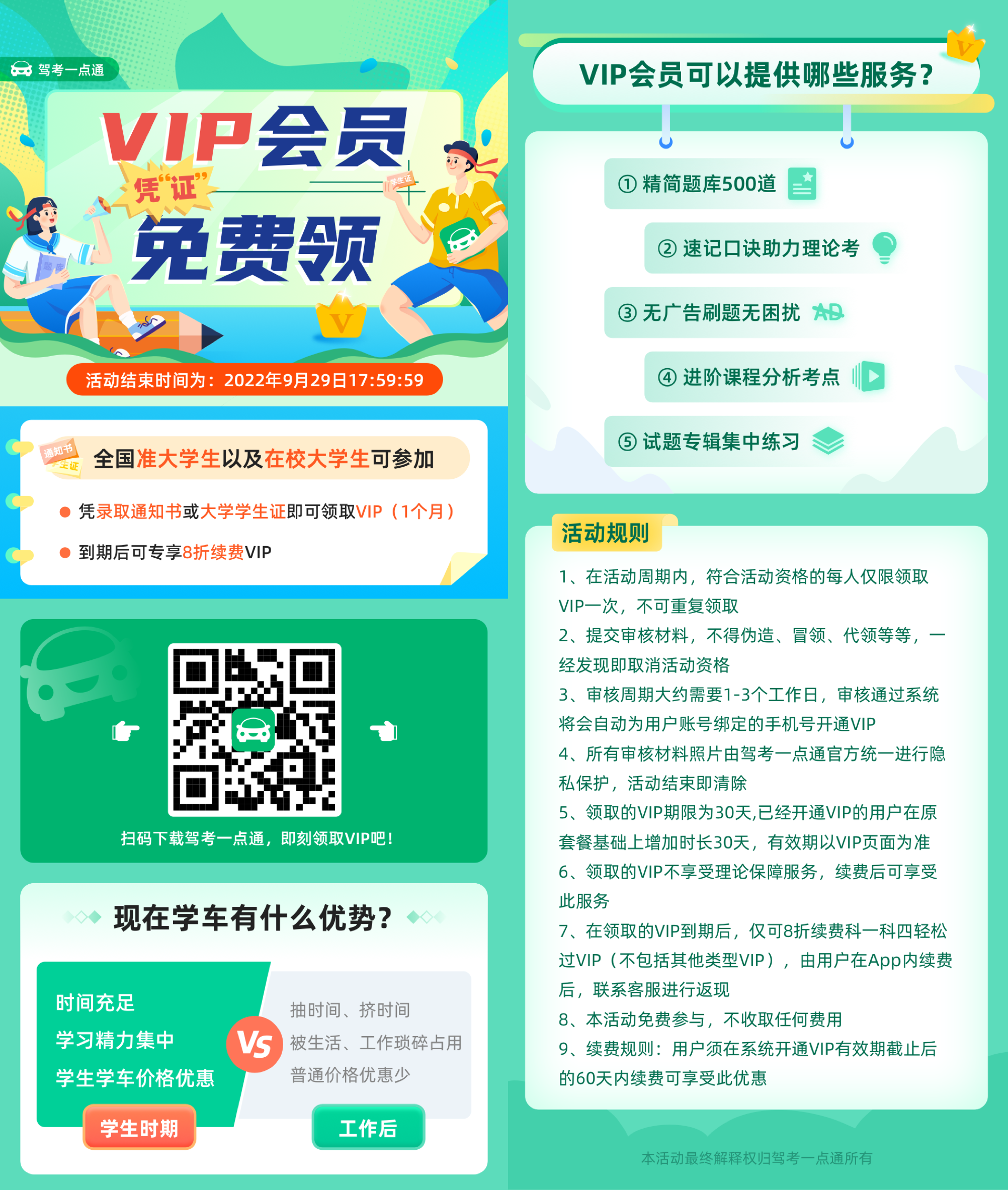 九月正值开学季学车热潮,为了帮助小伙伴们顺利拿到驾照,驾考一点通学车vip免费领!!!划重点:不止准大学生,全国在校大学生都可以参与噢!赶紧来看看吧~