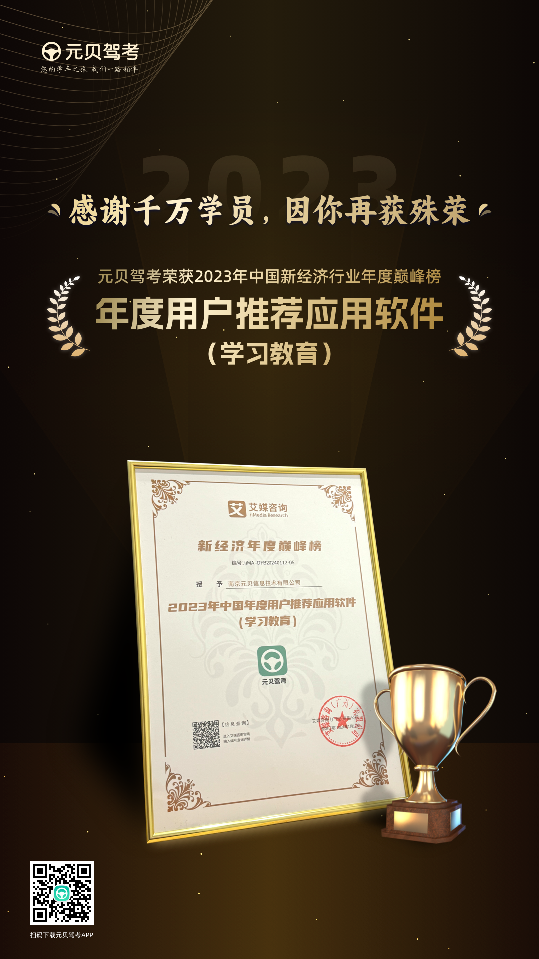会上,艾媒咨询重磅发布了“2023年中国新经济行业年度巅峰榜”获奖名单,巅峰舞台,群星闪耀。元贝驾考凭借其在学习教育领域的卓越创新力以及专业的服务能力,一举夺得2023年中国年度用户推荐应用软件大奖,展现出强劲的品牌实力。