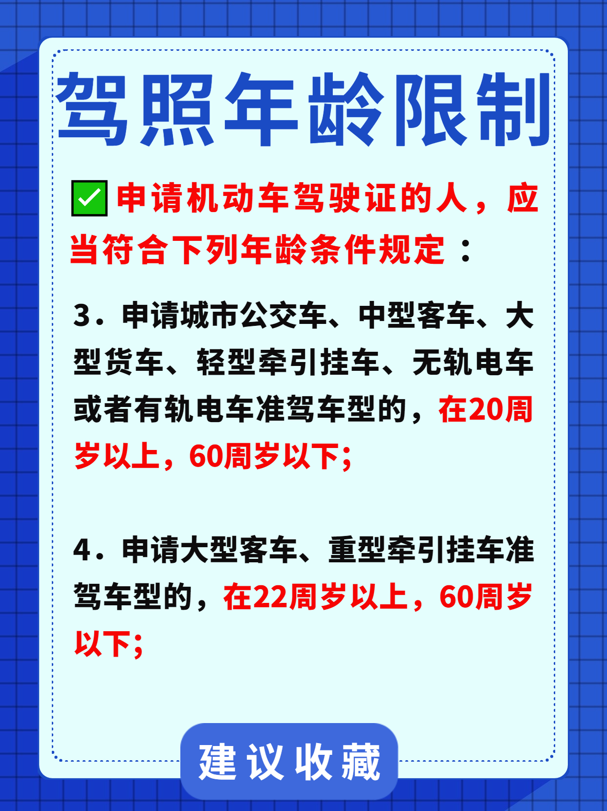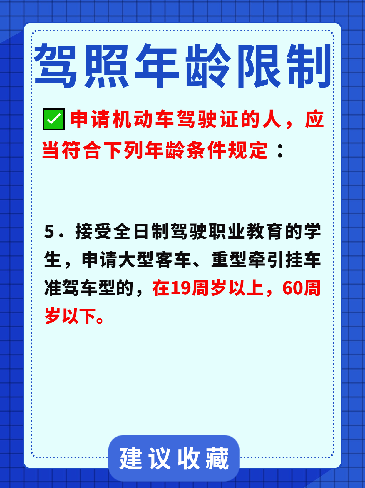 想开车,先拿证。拿什么证,就对号入座开什么车。但是,开车年龄也有限制。当你到了某个年龄的时候,就不可以再开车上路了。不能开车了,对于客车和货车司机来说,意味着丢了饭碗······