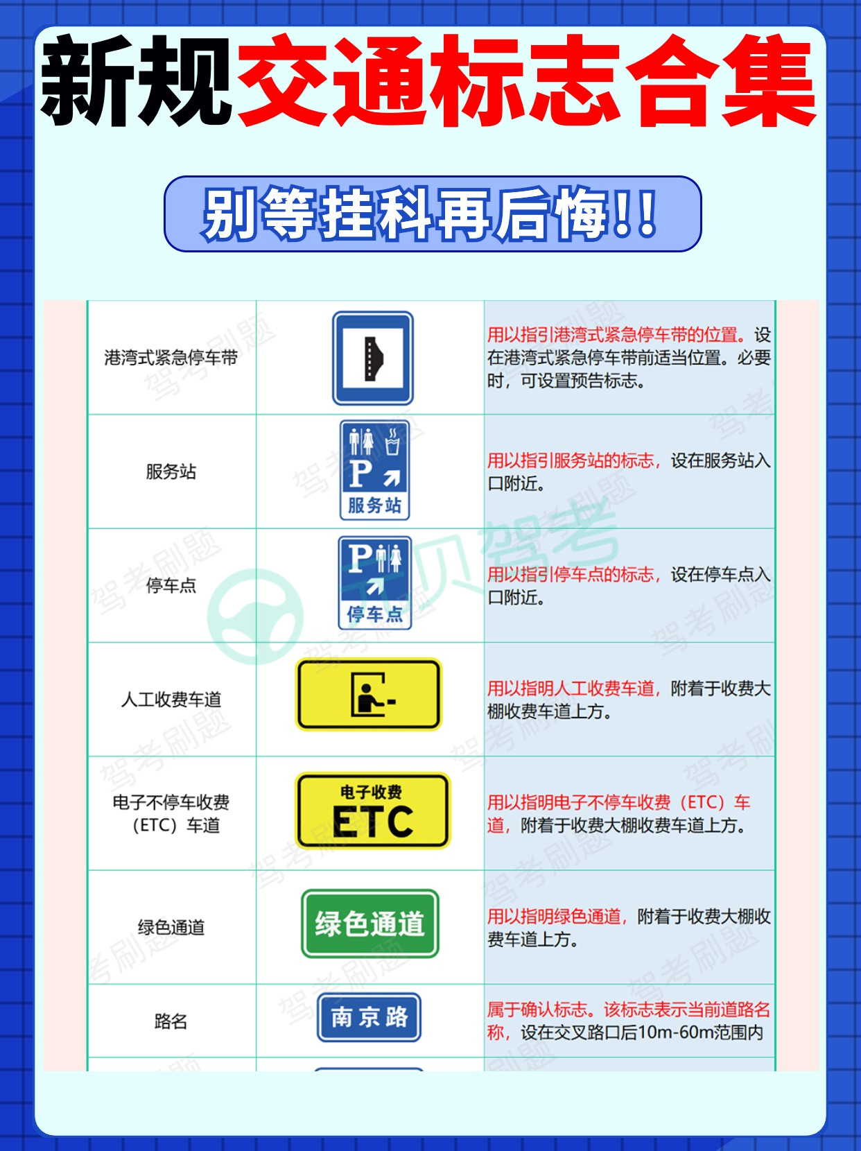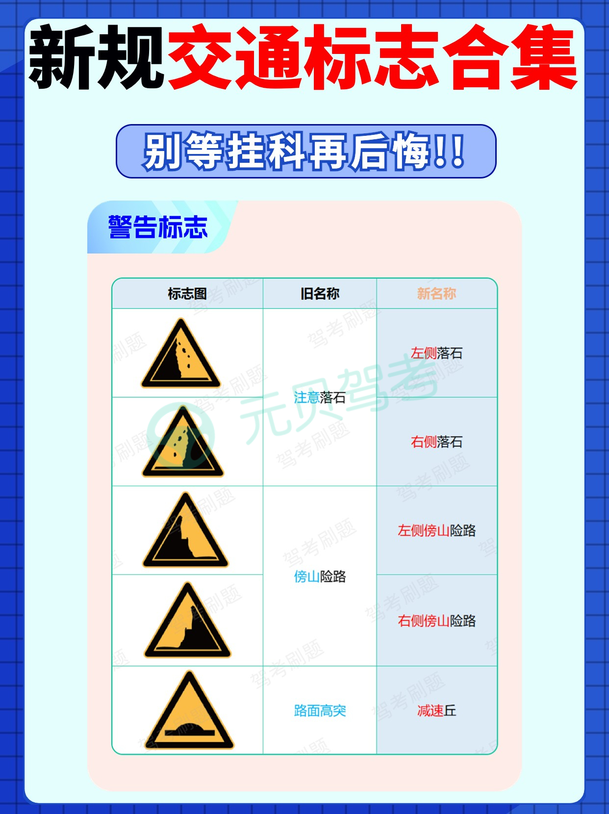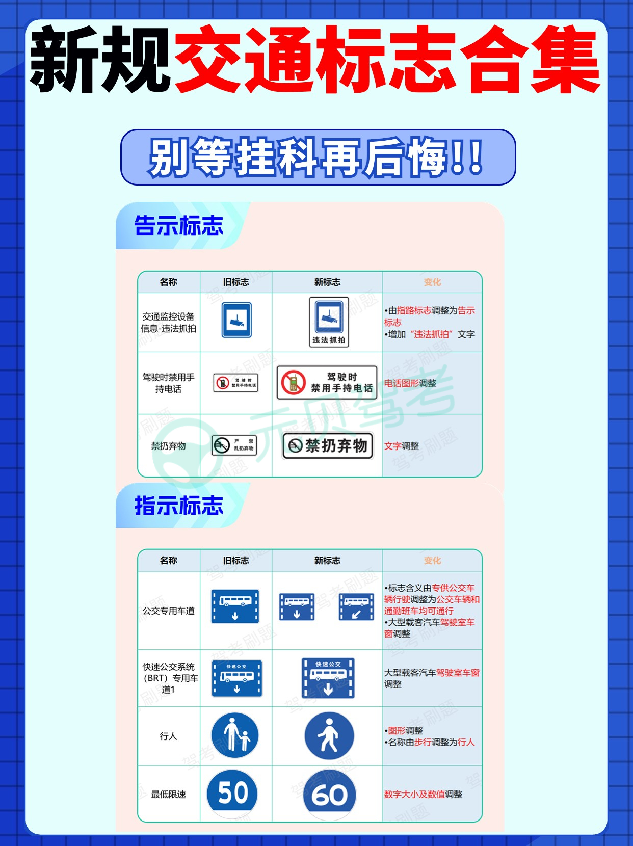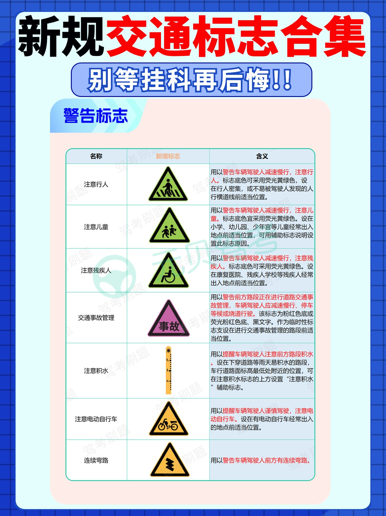 在科目一考试中,道路交通标志是考试题当中的常考的题目,面对这些五花八门极易混淆的交通标志,大家一定要多看,多了解。学会看这些交通标志不仅考试能加分,对于以后开车上路也能少扣分,少罚款!一起来看下吧!
