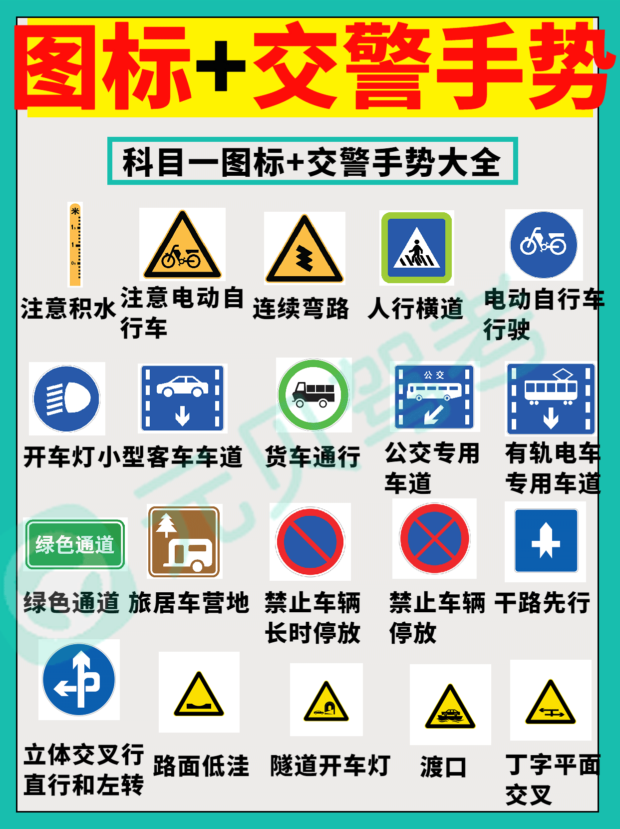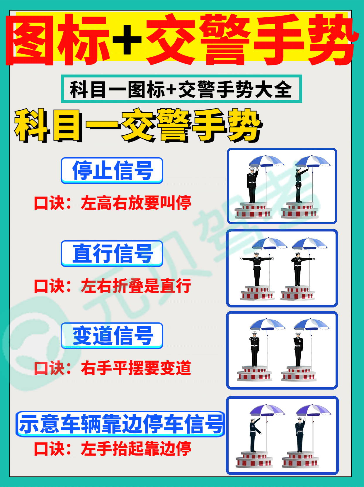 所以说掌握交警手势题以及看懂图标含义不仅对科目一科目四考试很重要,对以后开车上路也十分必要!!今天就跟着元贝驾考一起来看看这8种常见的交警手势以及交通图标合集吧!有需要的可以保存下来再看噢~
