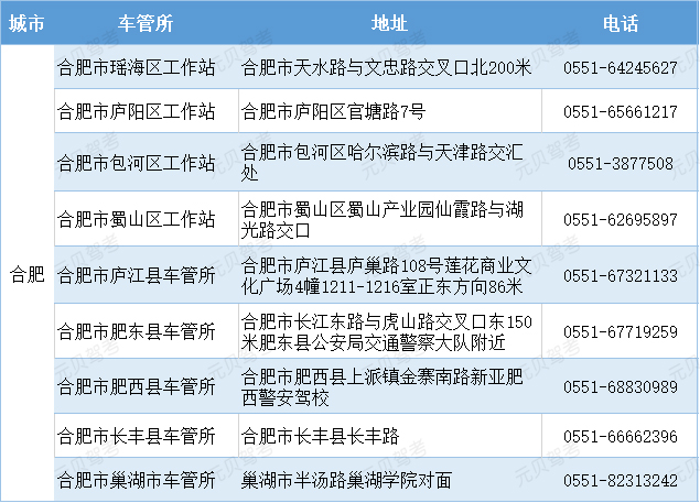 元贝驾考小编为合肥市驾校学员整理了当地车辆管理所地址、办公电话,让您不费劲效率查询! 点击看。更多车管所资讯、交管12123操作指南,免费领取。