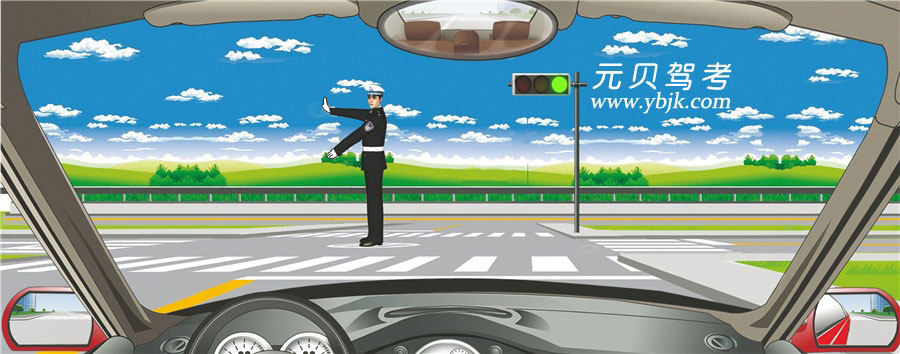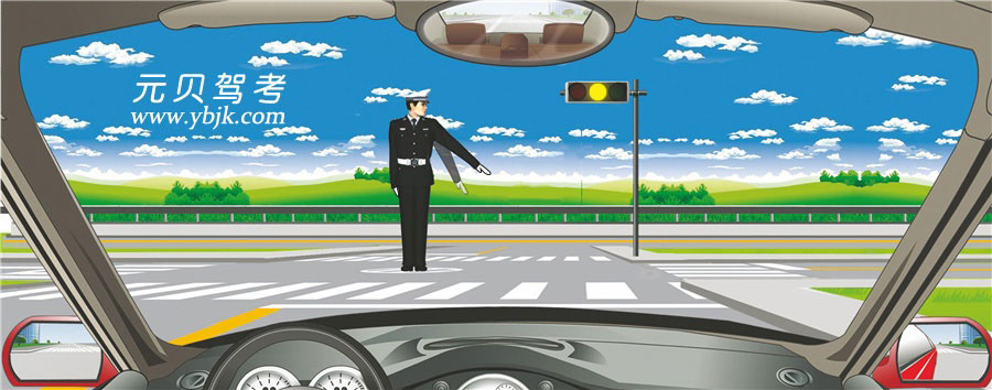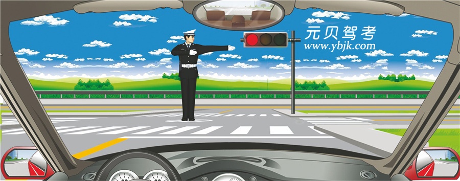 题目三:驾驶机动车看到交通警察发出这种手势信号时应当停车等待。