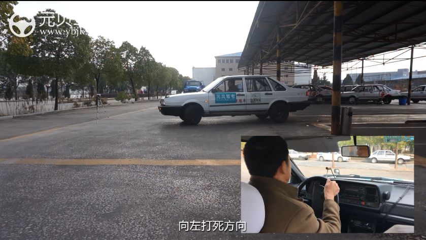 点位⑥:向左出库,挂一挡打左转向灯,直行至肩膀与左边库角线对齐时,向左打满,驶出。
