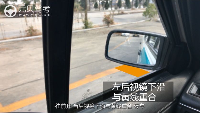 点位②:挂倒挡,换抬离合,倒车,当左后视镜下沿完全盖住起点线,向右迅速打满;
