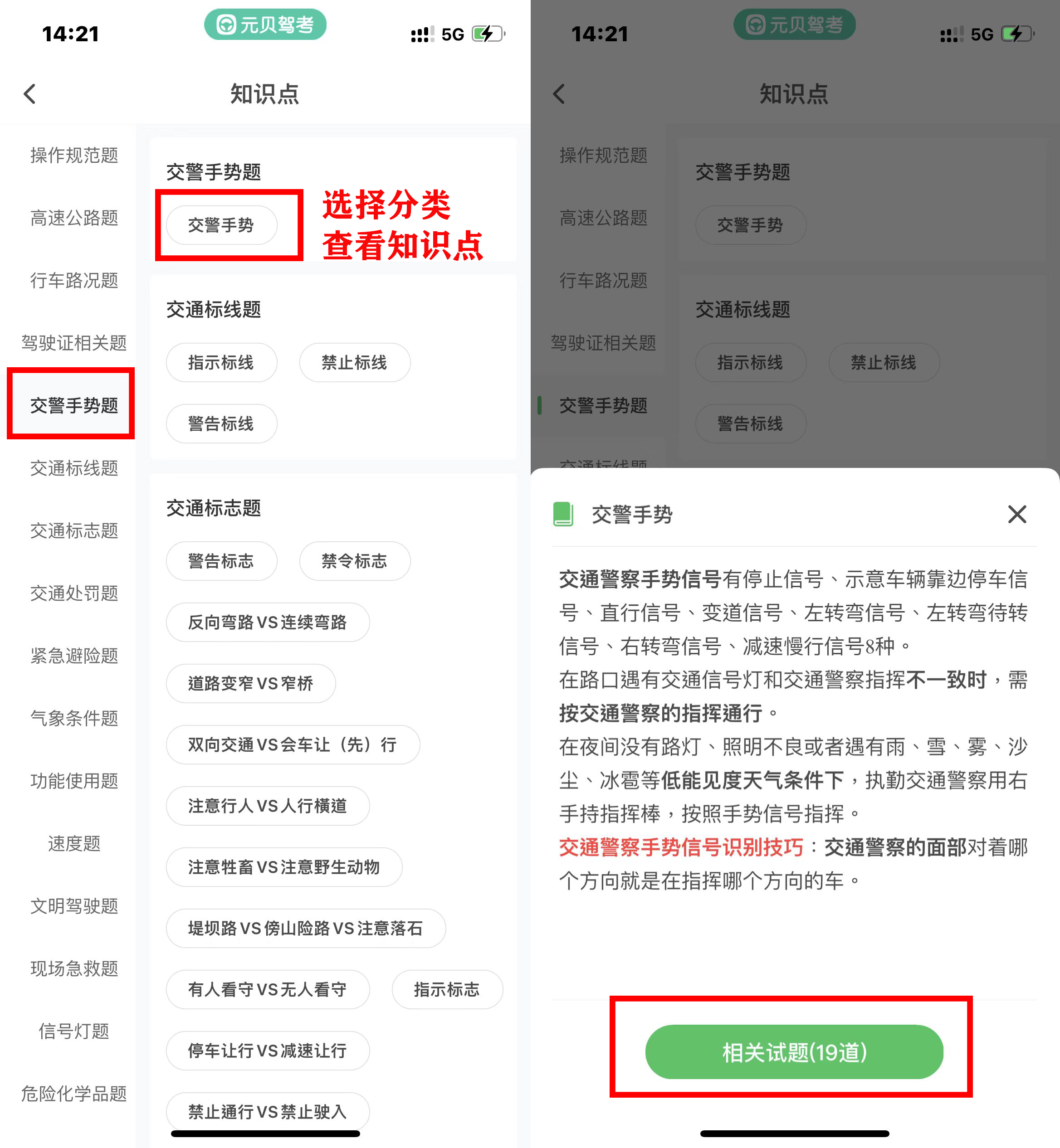 拿常考的【变更车道】和【交警手势】为例,如果我们想查看这两个知识点的内容和相关题型,具体操作步骤如下: