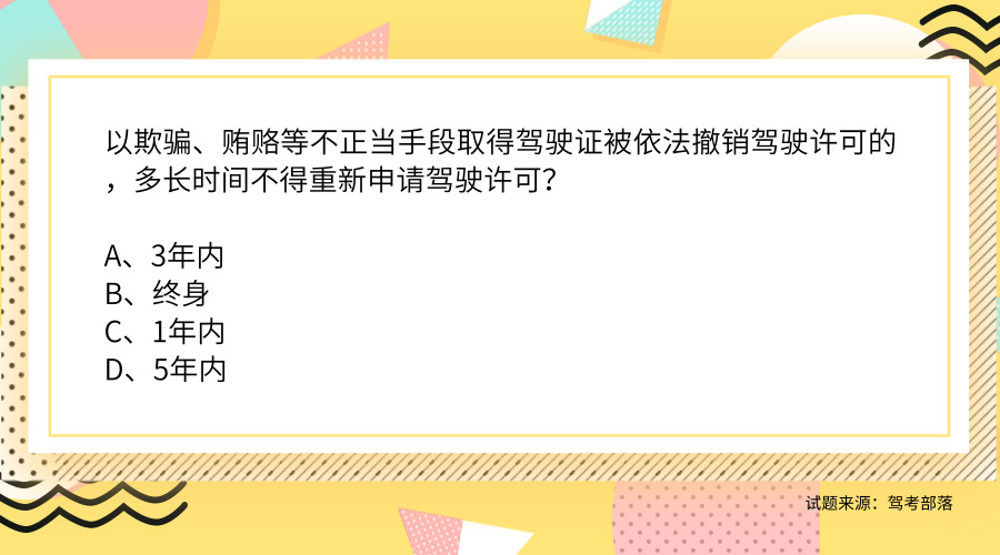 元贝提醒:关于几年内不得再次申请驾照的,教大家一个口诀:假一,吊二,撤三,醉五,逃终生。意思分别是,参加考试弄虚作假的1年内禁止考试;吊销资格的2年内不得申请;撤销资格的3年内不得申请;醉酒驾驶的5年内不得申请;造成重大交通事故后逃逸的终身不得申请。更多科目一内容,进入元贝驾考app查看~
