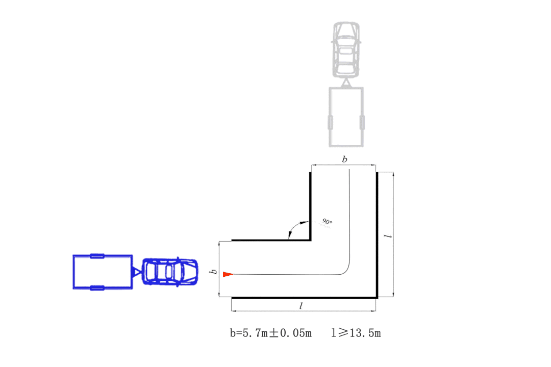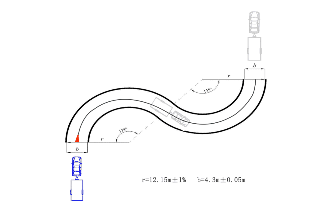 考试要求:考试车从弯道的一端前进驶入,从另一端驶出。行驶中车轮不轧压车道边线,中途不应停车。