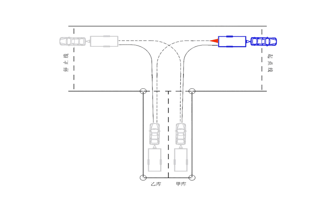 考试要求:从起点线倒入乙库停正,后出库过停止线,倒入甲库停正,最后出库返回起点。考试过程中车辆不能碰擦桩杆,车身不能出线,项目完成时间不超过8分钟。
