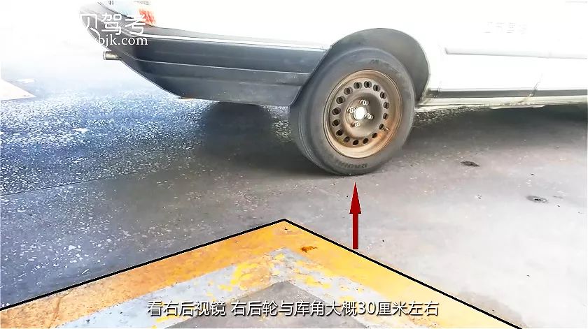 第三步:看右后视镜,一般保持车轮实际距离库角30cm左右即可;【若距离有些近,可以回半圈调整,调整后获得合适距离依旧需要向右打满】