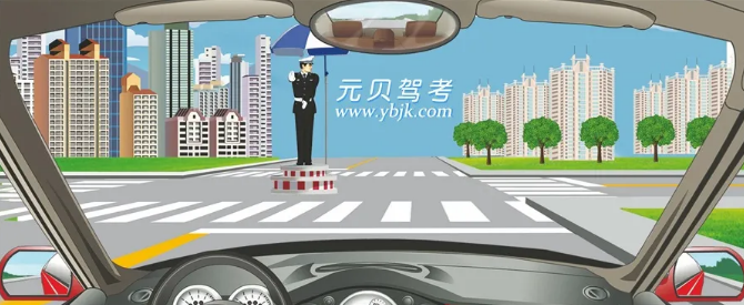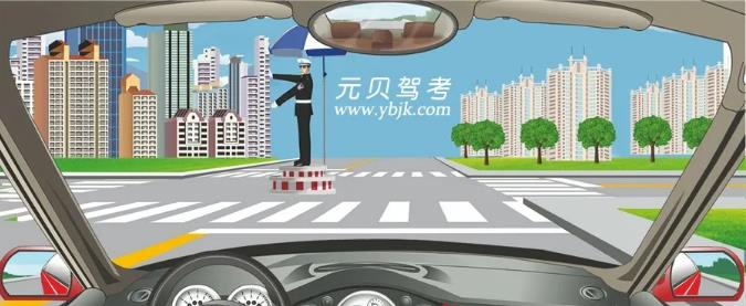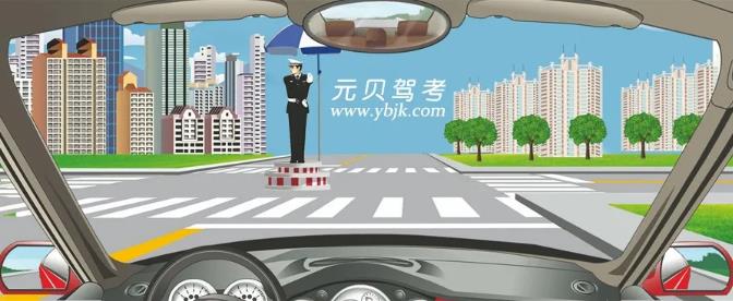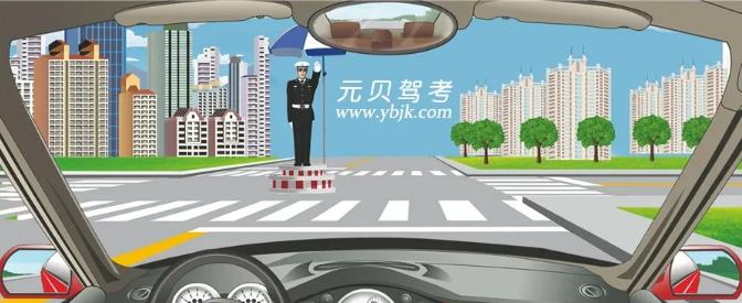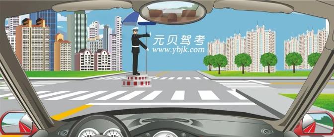 解析:警察手势为停止信号,示意:不准前方车辆通行,也就是停车等待。