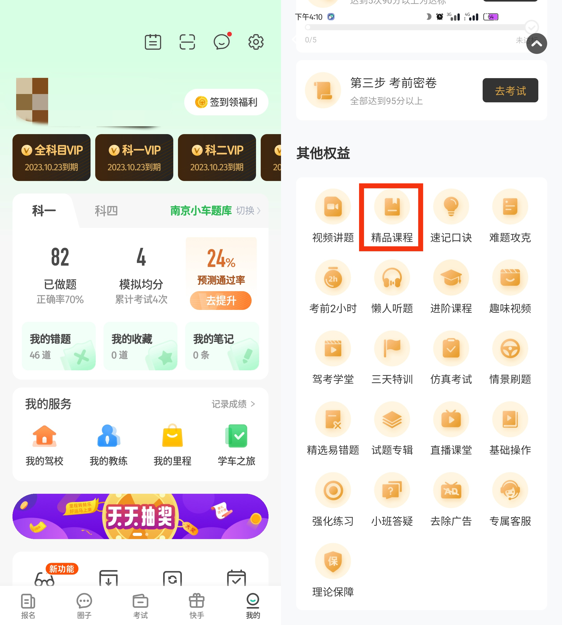 温馨提示:精品课程只适用于“科一科四速成vip”与“全科目通关vip”,暂未在“基础版vip”中上架。此外,“科一科四速成vip”可观看理论考试内容视频,而“全科目通关vip”可观看全科目精品教学视频!