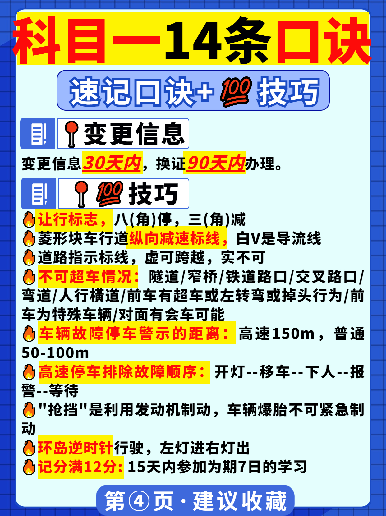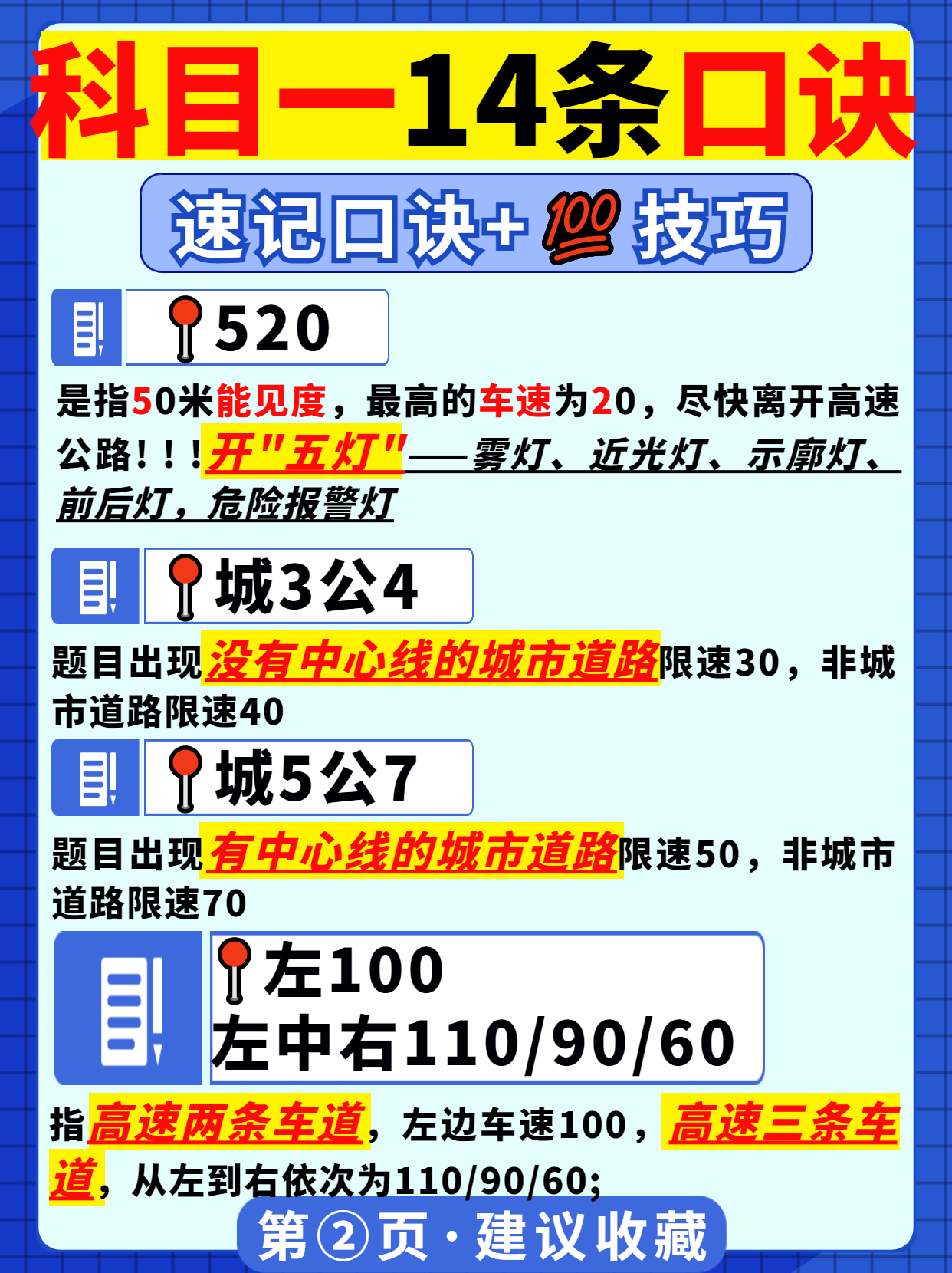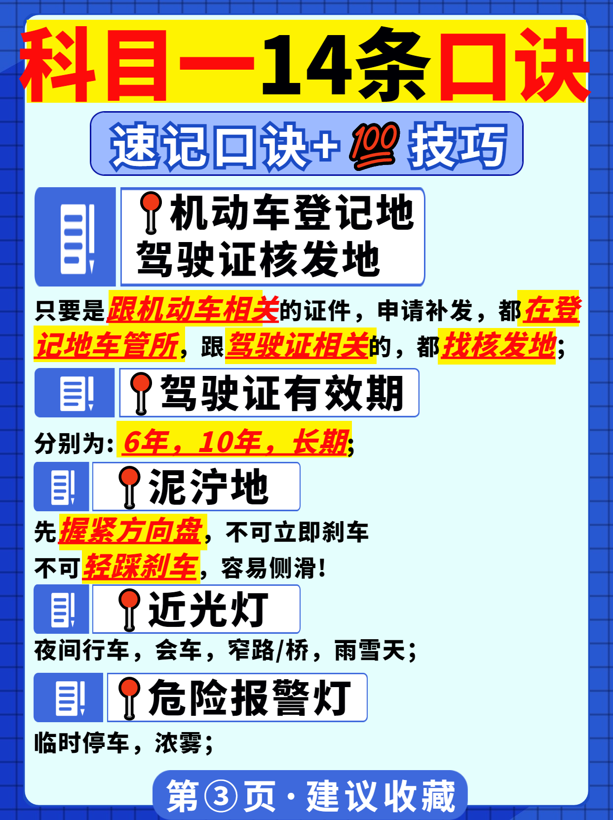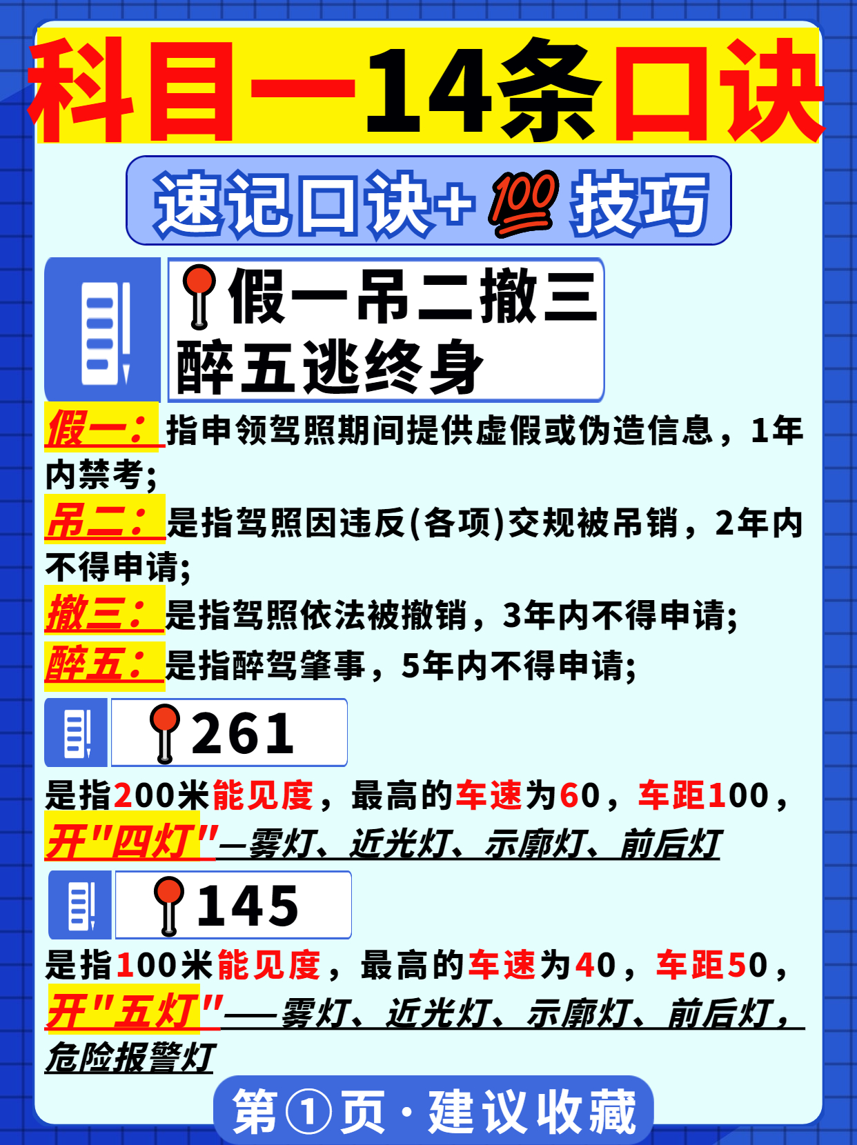 考驾照之前,有的学员埋头苦刷题,想用题海战术拿下驾考科目一,却发现效率奇低,遇上易混淆的题目又崩溃了!怎么办?今天元贝驾考小编准备了14个科一速记口诀,希望各位都能💯过科一,关于罚款扣分的相关笔记也整理好了~