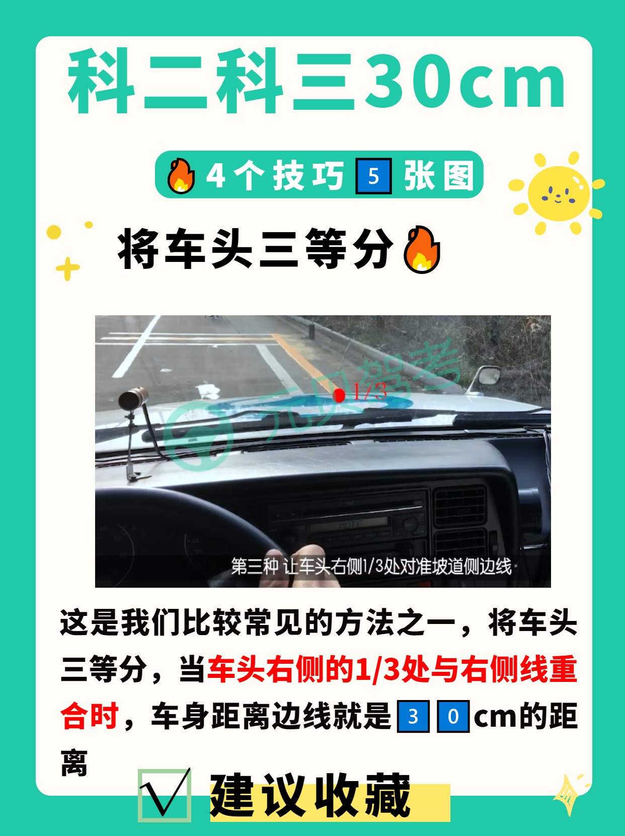 这是我们比较常见的方法之一,将车头三等分,当车头右侧的1/3处与右侧线重合时,车身距离边线就是3️⃣0️⃣cm的距离