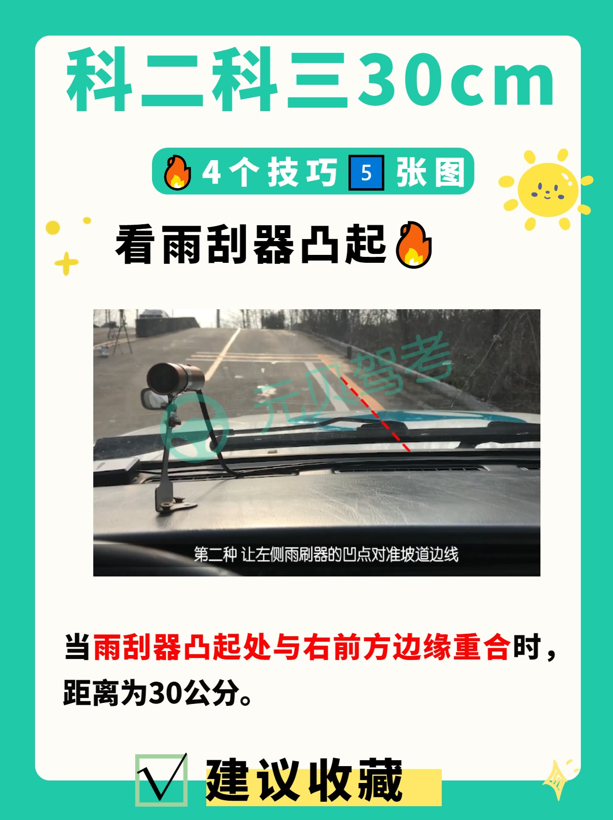 当雨刮器凸起处与右前方边缘重合时,距离为30公分。