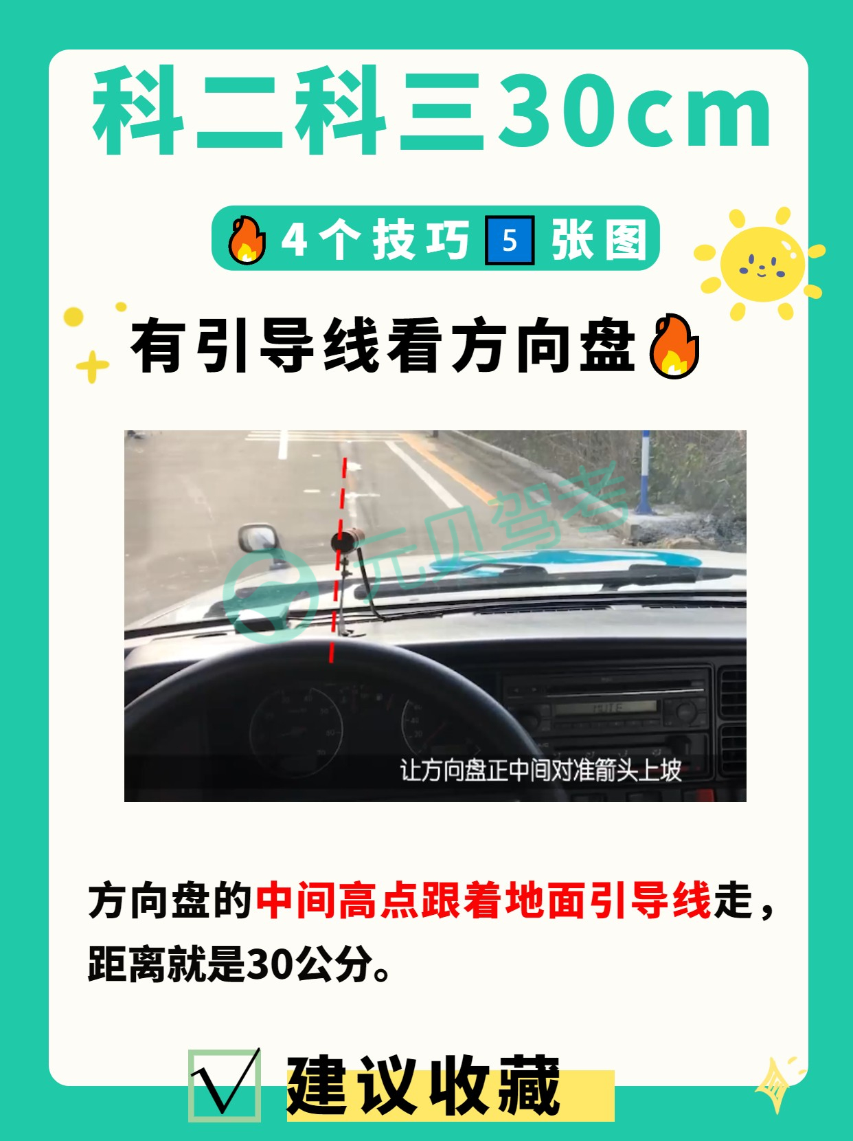 方向盘的中间高点跟着地面引导线走,距离就是30公分。