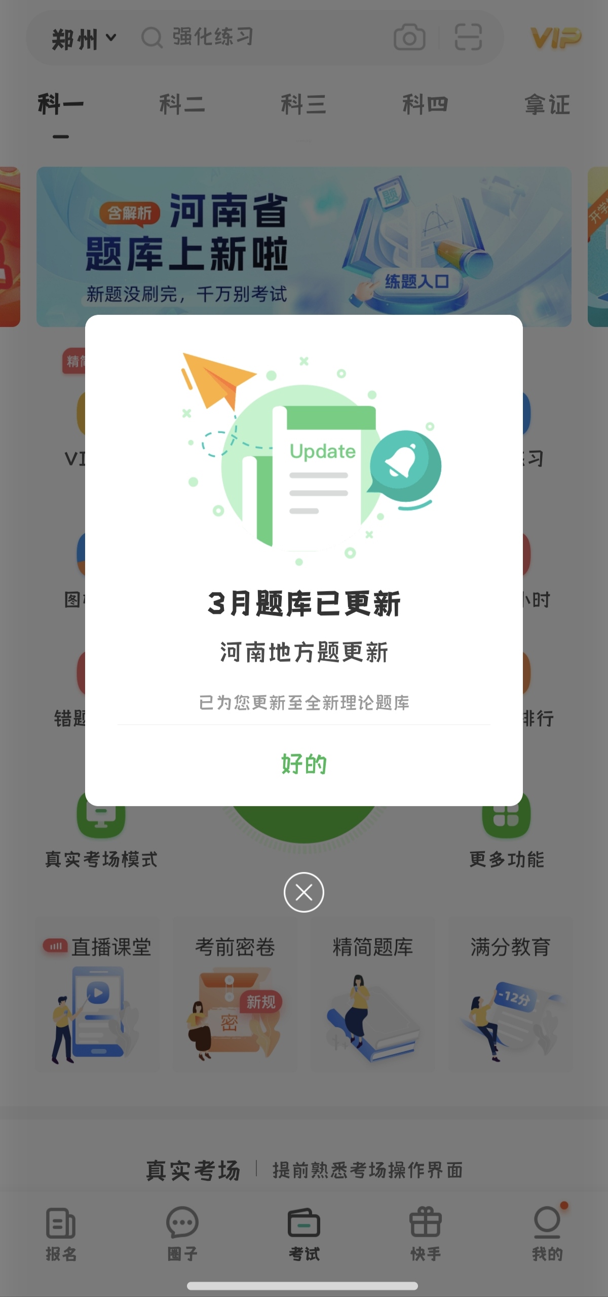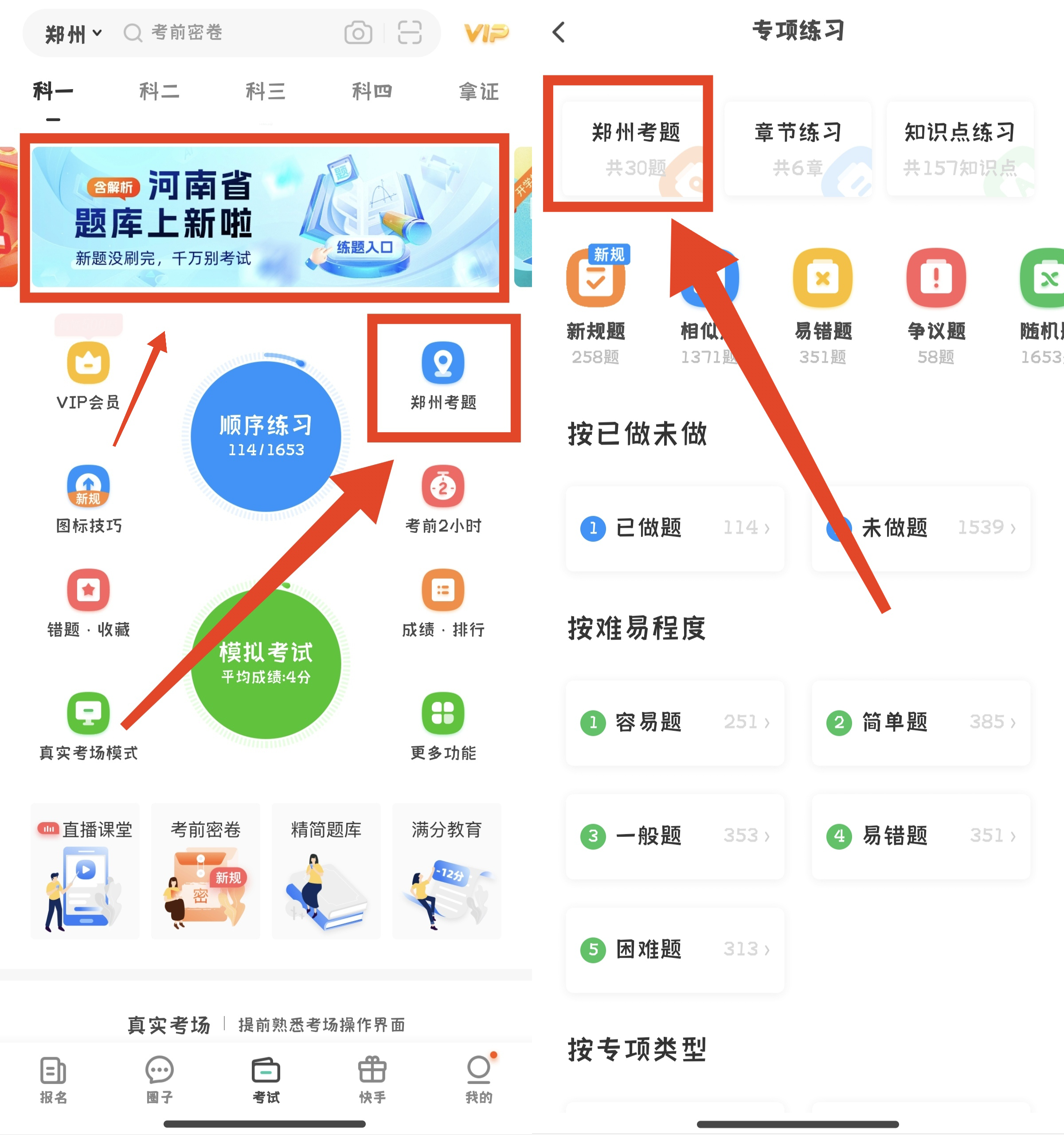 温馨提示:进入【考试页】,选择【科一】,点击上方的轮播图或者你所在地区的考题,如:郑州考题,就可以练习本次新增考题了。