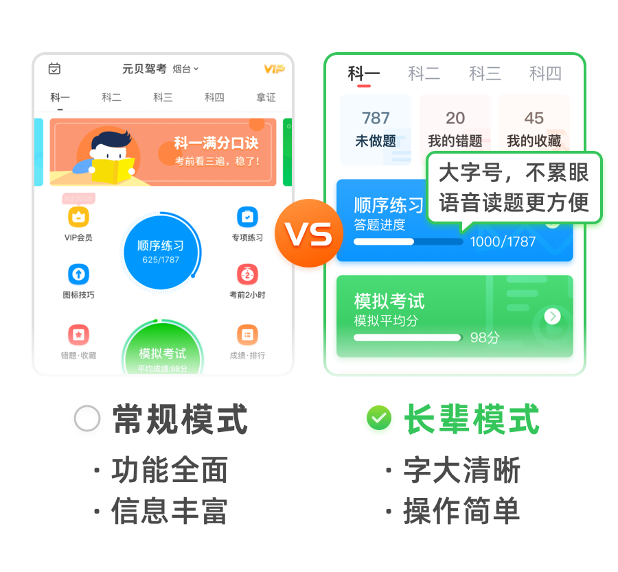 元贝驾考app常规模式下,功能全面且信息丰富,但对于高龄学员来说,这种模式就有些不太友好了,用久了眼睛累、看不清字......而长辈模式——大字号、不累眼、易操作!