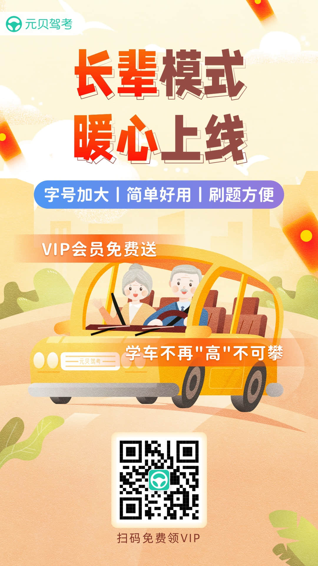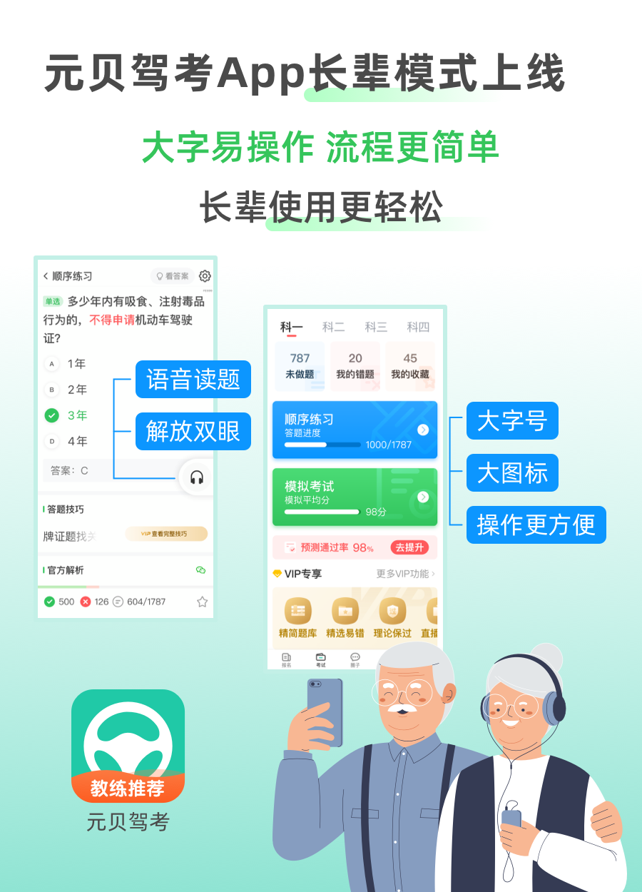 当然,学车小师妹觉得千言万语都不如——给身边学车的长辈们推荐元贝驾考app来得贴心!长辈们接受新事物能力的下滑以及受自身视力、记忆力下降的影响,在使用市面上已有的学车app时,总有些吃力,而元贝驾考app早已考虑到这些问题,近期已暖心上线“长辈模式”,全网先发👍!此外,即日起至10.17期间更有重阳节福利免费派送🎁!