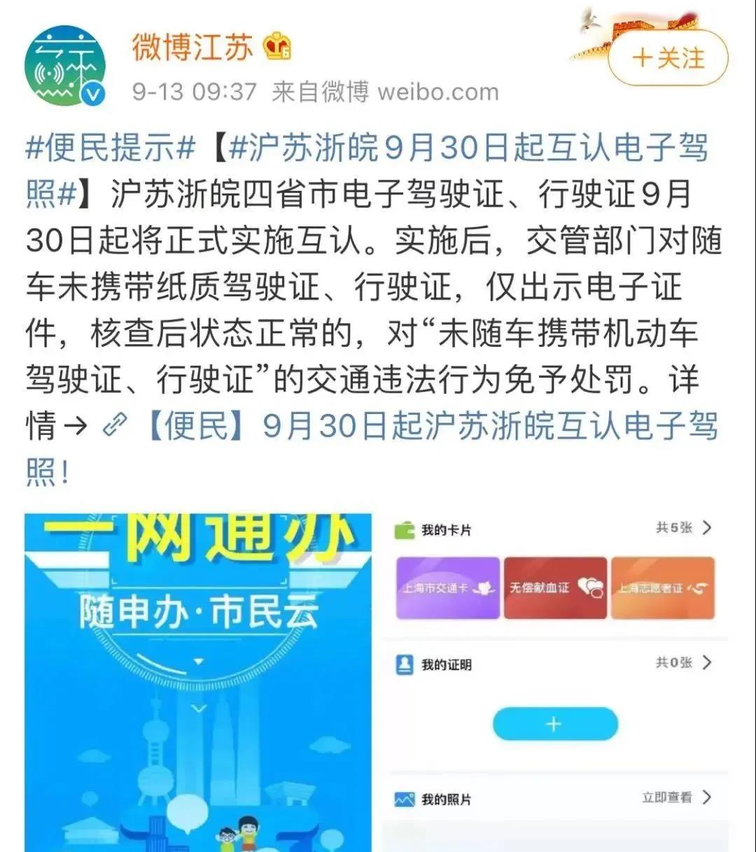2020年9月30日起,江浙沪包邮区 安徽四省市的电子驾驶证/行驶证互认”。