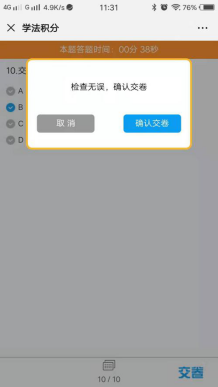 每次考试随机抽取10道题,答对9题及以上者考试合格获取积分1分,考试完成后可点击【确认】返回pa8九游会首页,也可点击【查看错题】,查看答错的题目及正确答案