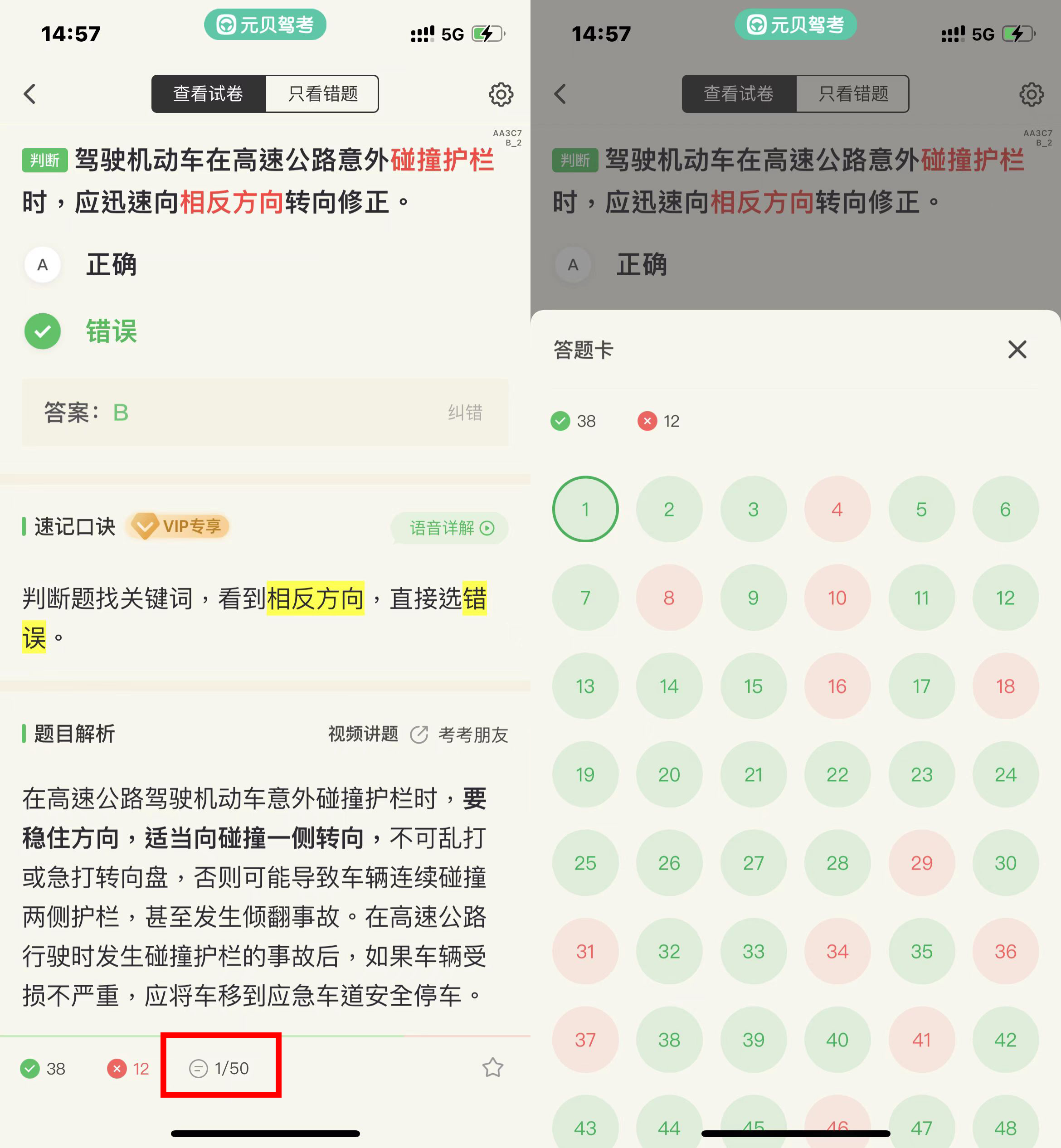5.查看答题卡,题号红色的是做错题,题号灰色的即为漏做题,可以点开题号具体查看该试题。